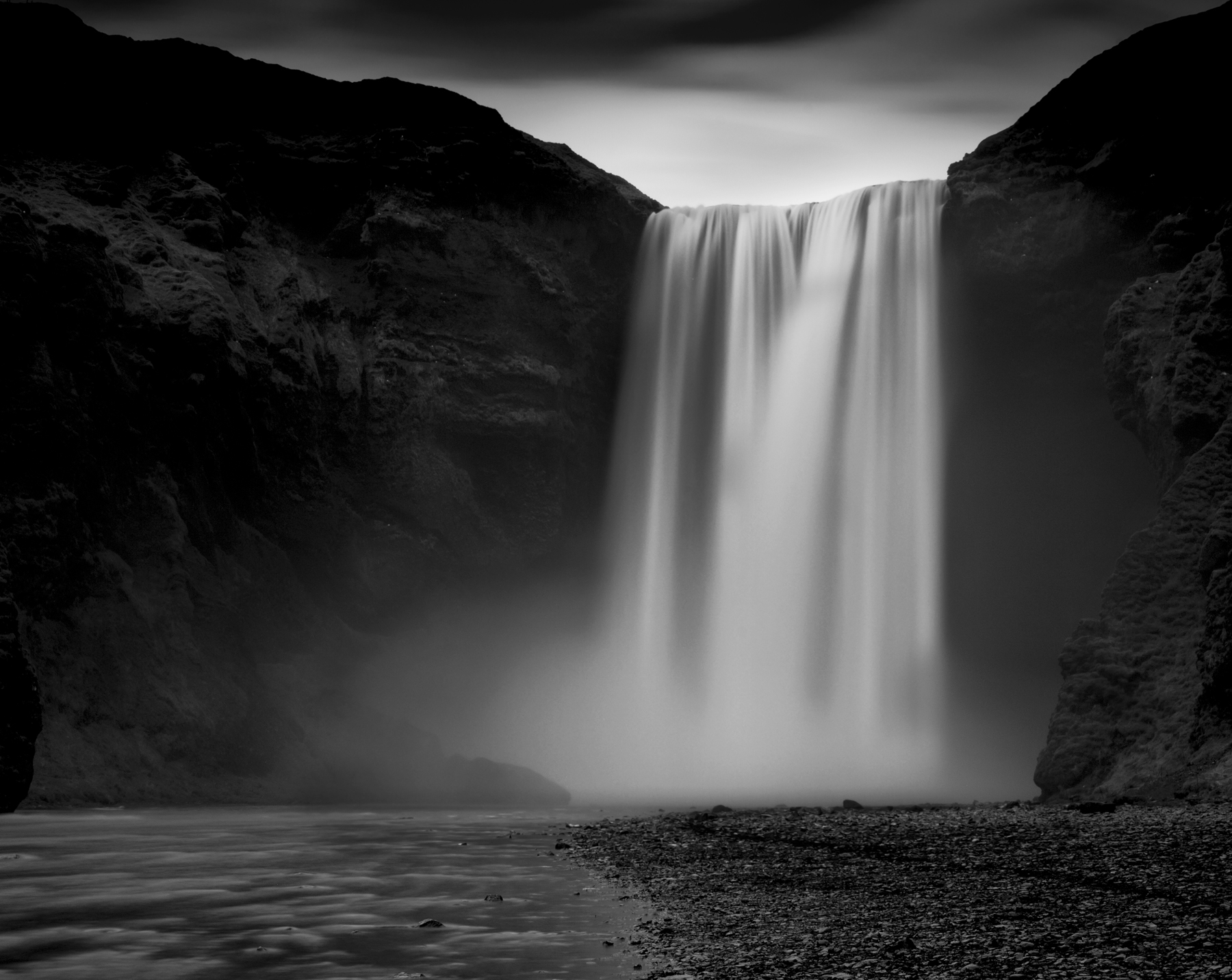 Una base 50 e 50, combattuta tra acqua e terra, la cascata tecnicamente elaborata con i tempi lunghi e costretta da pareti imponenti, come a frenarne l'irruenza naturale, e infine un cielo che costringe inesorabilmente la visione verso il salto, nelle gradazioni decise tra il bianco e nero.