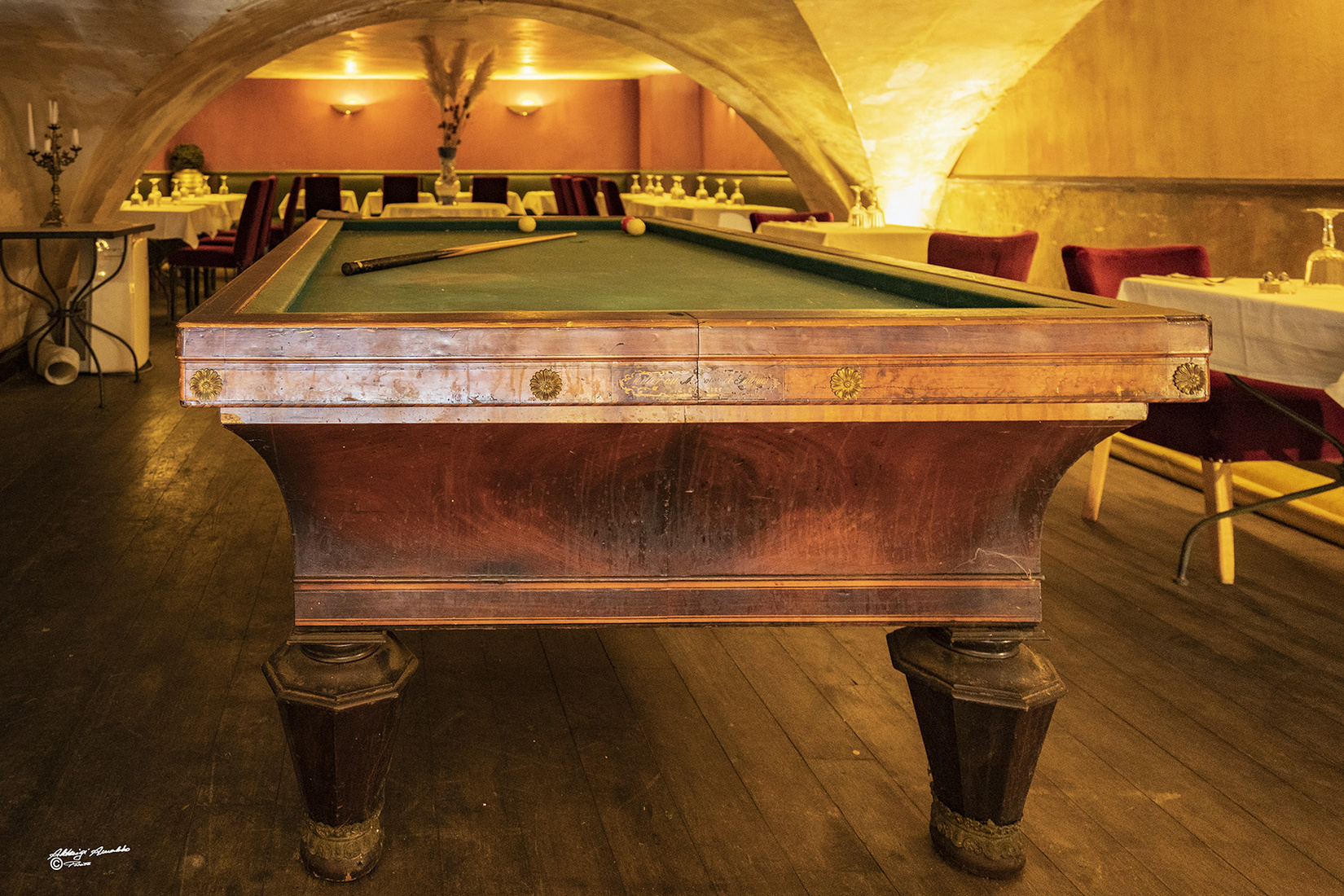 Ero con un gruppo di amici fotografi e non,La proprietaria del locale molto gentile ci a fatto salire al piano superiore dove si trova questo biliardo col la stecca sul piano del biliardo panno mezzo rotto e bilie..dove abbiamo potuto fare vari scatti,che in altri si vedono si persone, ma fanno parte di noi..però ne o anche una con il quadro sulla parete di fronte al biliardo che posterò più avanti..