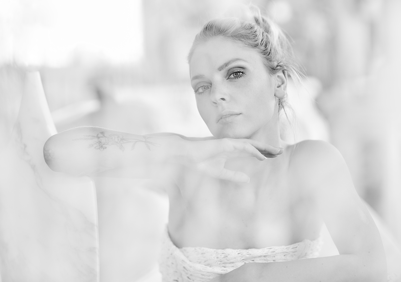 Il titolo è solo apparentemente ironico, l'ambiente è davvero lo studio di un marmista. Ho ripreso la modella attraverso una barriera costituita da piante secche, sfumate il più possibile aprendo molto il diaframma. L'occhio "spara" perché non era coperto dalle piante.