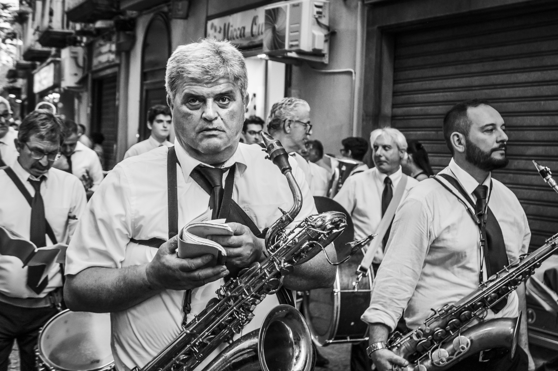 Il volto del sassofonista di certo campeggia e ci attrae. Tuttavia anche gli altri volti che, seppur fuori fuoco risultano ben leggibli, accompagnano questa teoria di verace umanità.