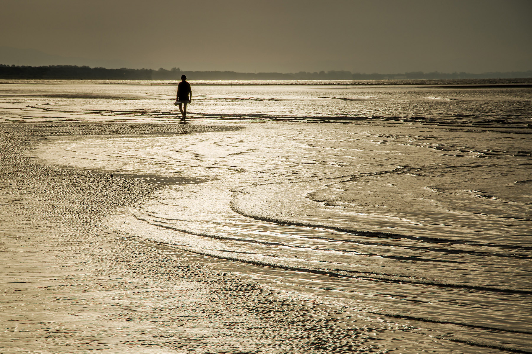 Controluce di classe, mare dorato e la figura perfettamente scura che si staglio sull'oro dell'acqua