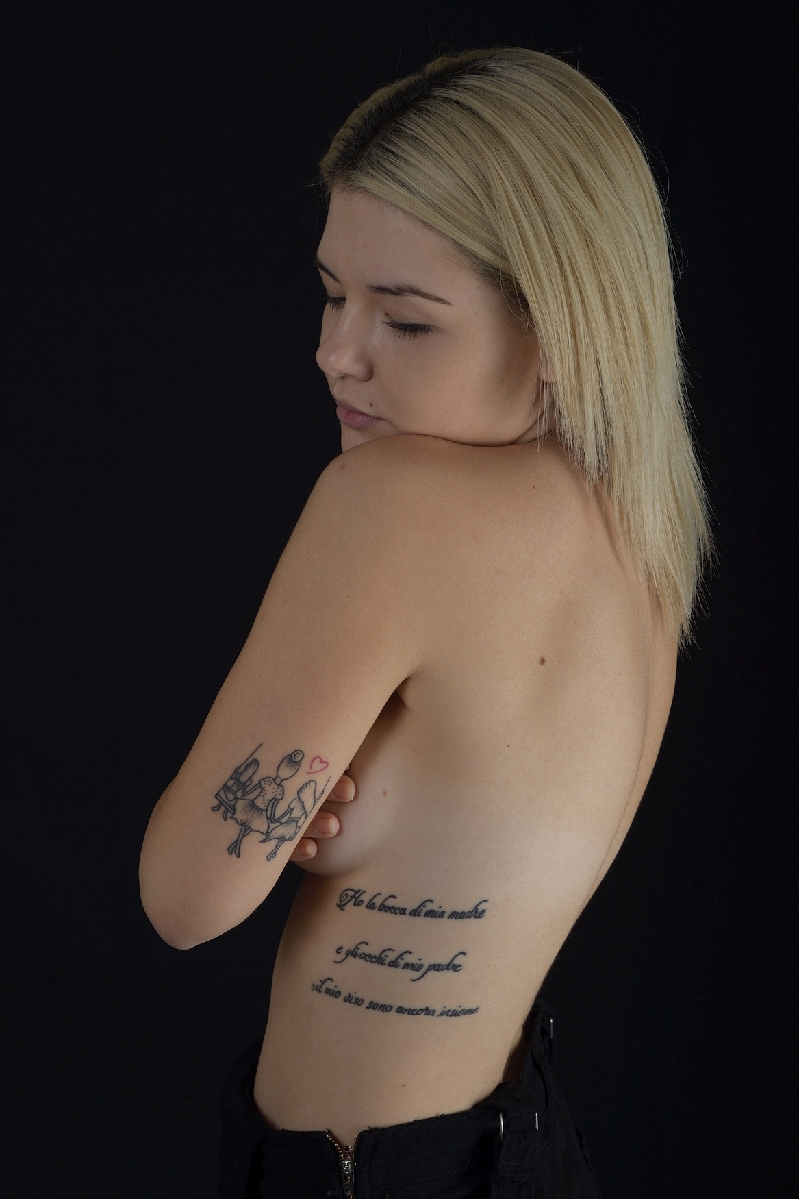 La posa della modella e il mood dell'immagine si abbinano bene al tatuaggio sul corpo, che evoca il ricordo di un'infanzia probabilmente felice.