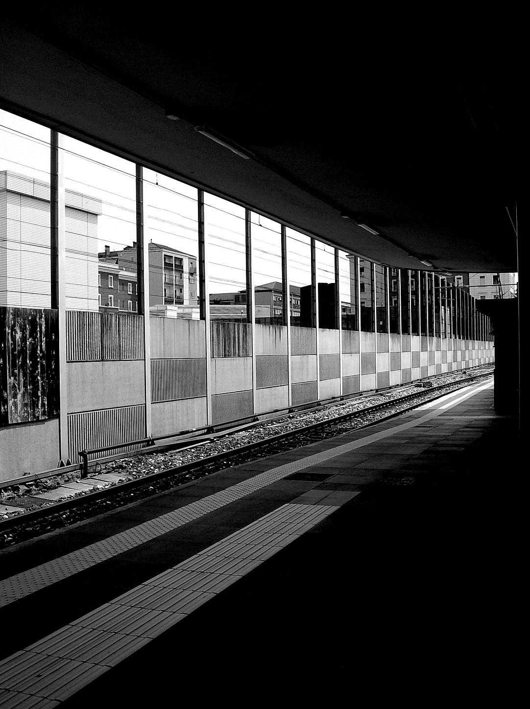 Una visione metropolitana tra ombre e luci, palazzi e infrastrutture.