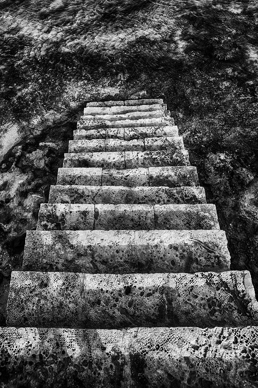 Buona la resa della materia e lo strapiombo. Forse da addolcire il contrasto del mare, si confonde troppo con le scale...