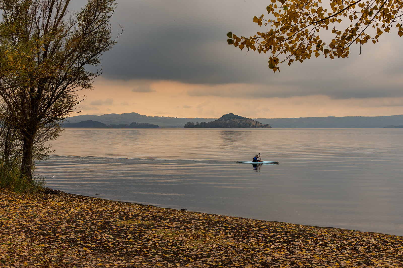 Il tappeto di foglie cadute a terra e la continuità cromatica dell'acqua con il cielo sono punti di forza proprio nel ricreare un ambiente particolare.