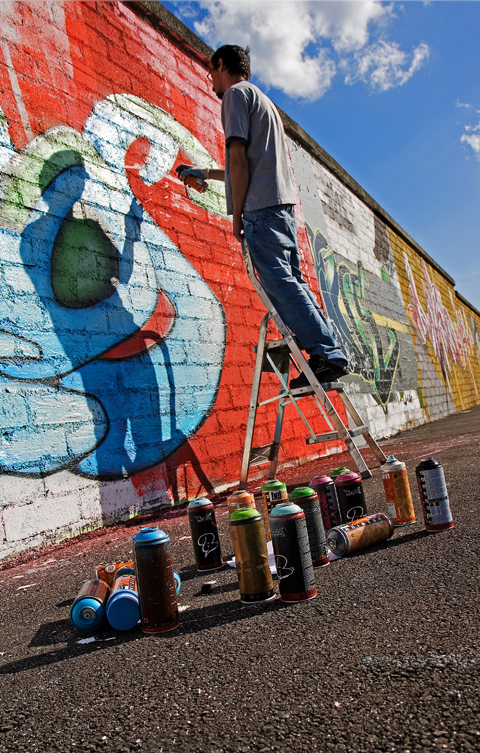 Un piacevole scatto,belli i colori del pittore..e tu a saperli riportare perfettamente,molto bella anche l'ombra del pittore che ai dato nitidezza..certo ne à consumate di bombolette..Un caro saluto e Buona domenica.
