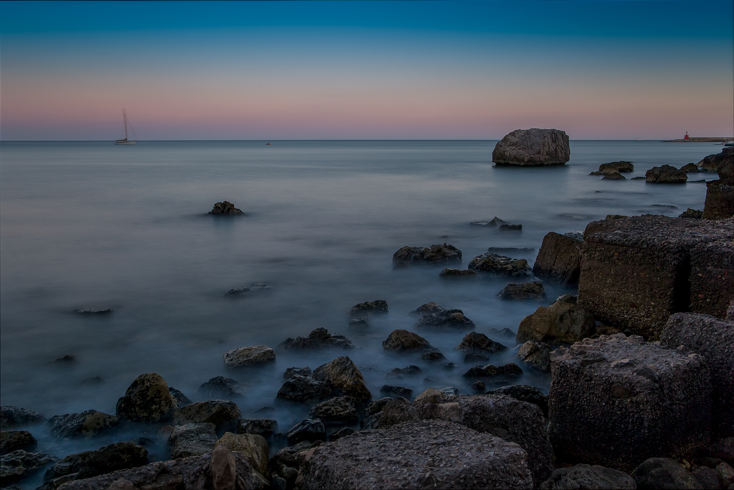 Composizione perfetta dove tutto trova la sua migliore collocazione,comprese le piccole barchette.Mi piace come la tonalità fredda viene interrotta sulla linea dell'orizzonte dal caldo rosa.Ottimo anche il tempo di esposizione con il suo effetto sul mare.Complimenti e preferita. Ciao