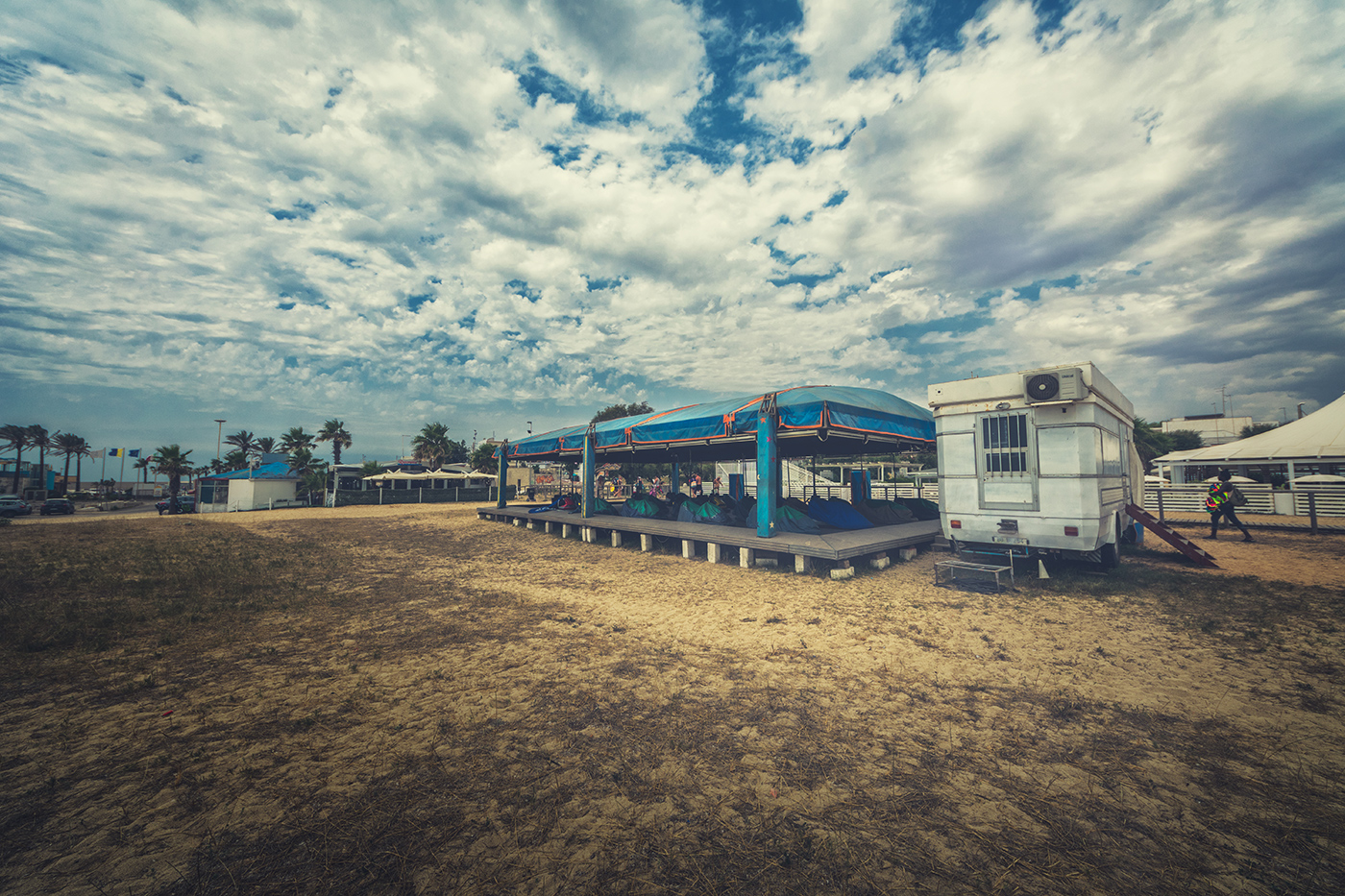 Un bel cielo sopra un paesaggio ordinario e tristino. Quella tristezza che serpeggia nei luoghi di divertimento quando sono fuori uso, anche se temporaneamente. Un paesaggio da retrobottega, di seconda mano.
