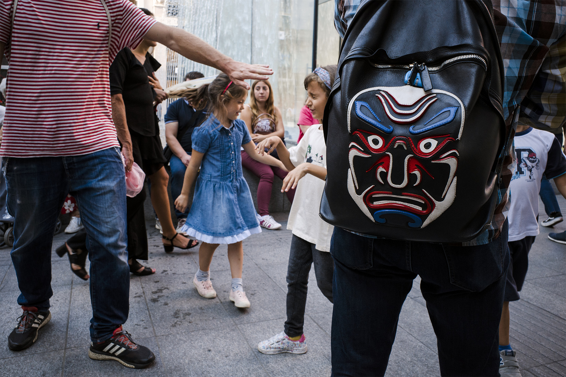 Notevole il contrasto tra la spensieratezza delle bimbe e la truce presenza sullo zaino.La mano tesa sembra poi intervenire a protezione.Bella!  _________________ Sergio Demitri https://www.flickr.com/photos/124946035@N02/ |