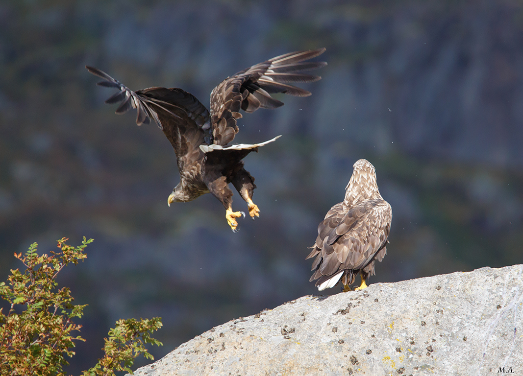 Coppia di aquile di mare coda bianca, scogliere fiordi Lapponia norvegese (Nordland), 200 km a Nord del circolo polare artico.