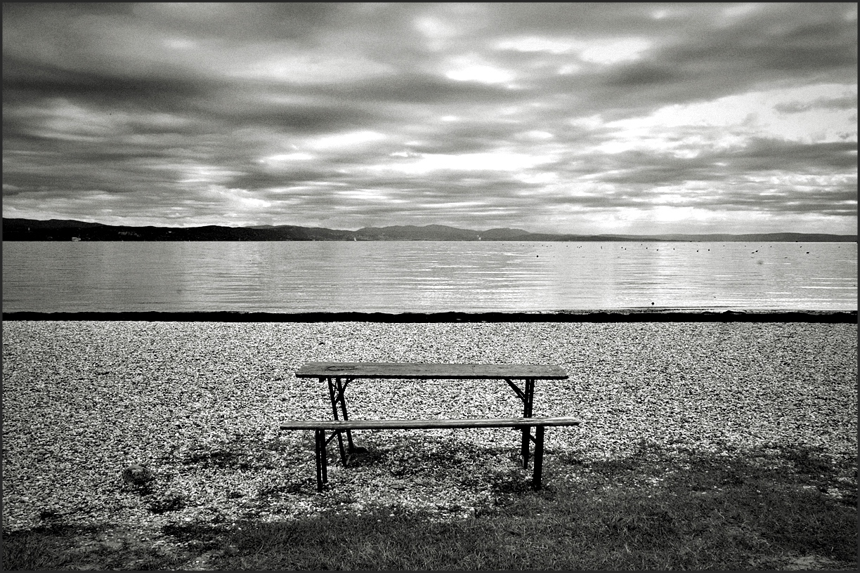 Il cielo cupo... la panchina vuota..ci dà sensazione di un po di malinconia. piacevole il b/n e proposta.