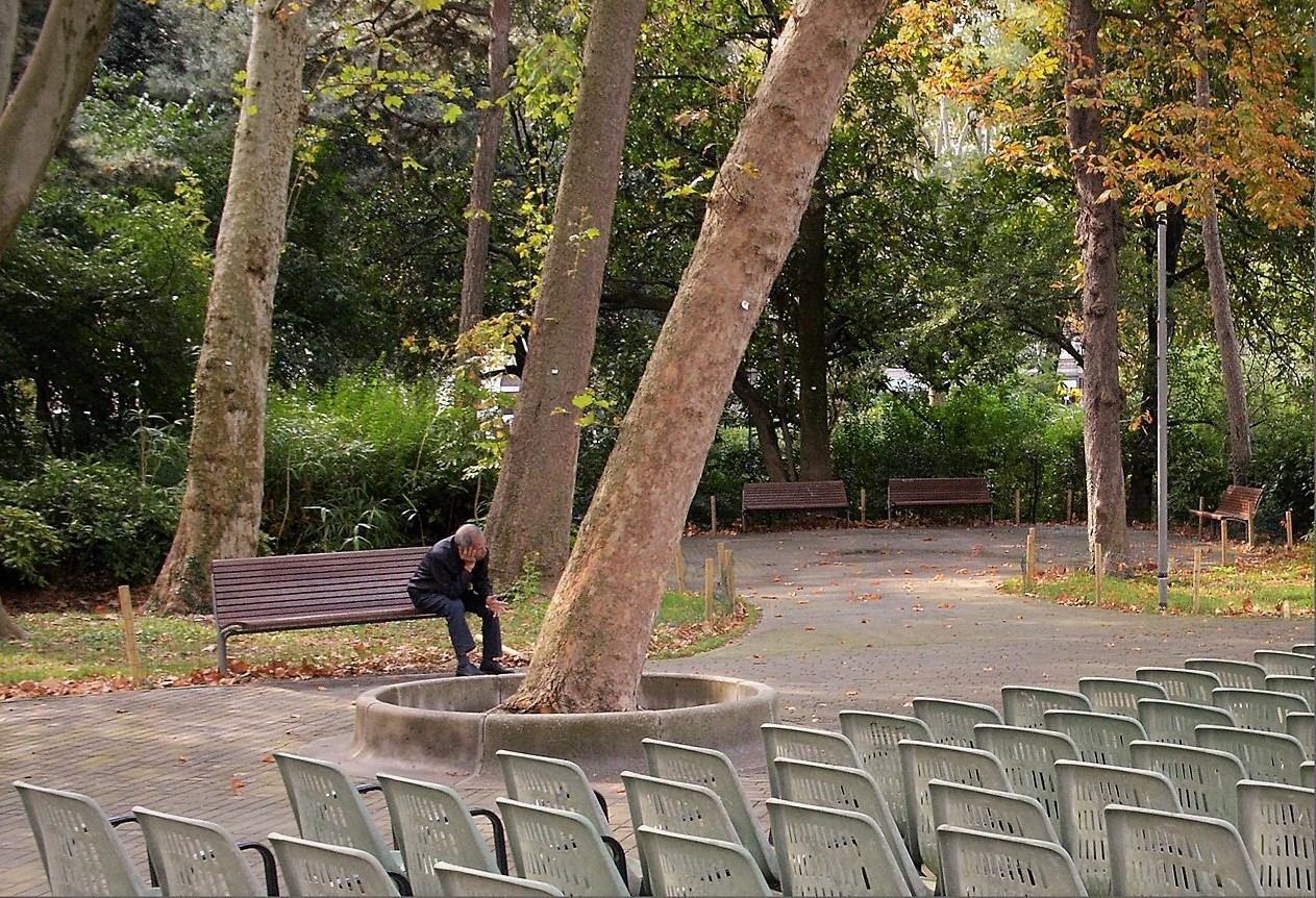 La sola presenza umana assolta nei suoi pensieri, ed allo stesso istante uno scorcio di sedie e panchine vuote con la caduta di foglie si percepisce un inizio di autunno un pò malinconico..Piacevole proposta da come la vedo io. Ciao