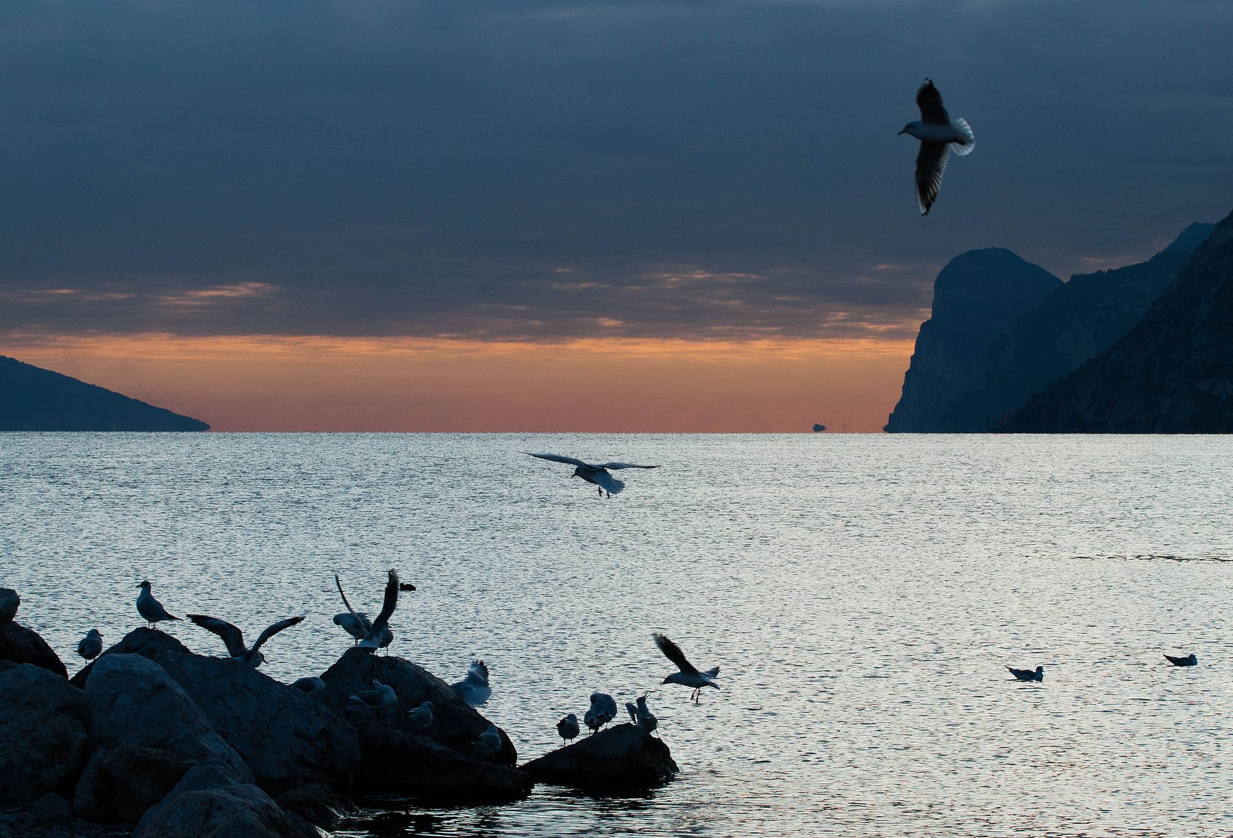 Bello stacco cromatico tra lago e cielo, con i gabbiani che animano la scena.