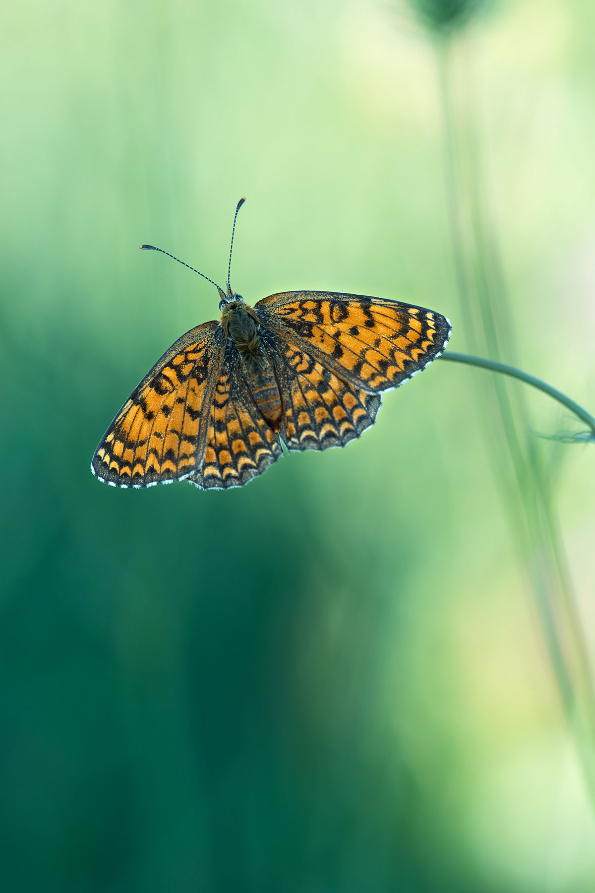 | Bella la ripresa aerea di questa melitaea. Da ricontrollare il bilanciamento del colore. Avrei preferito in questo caso il taglio orizzontale dando in fase di scatto più aria a destra dello stelo.