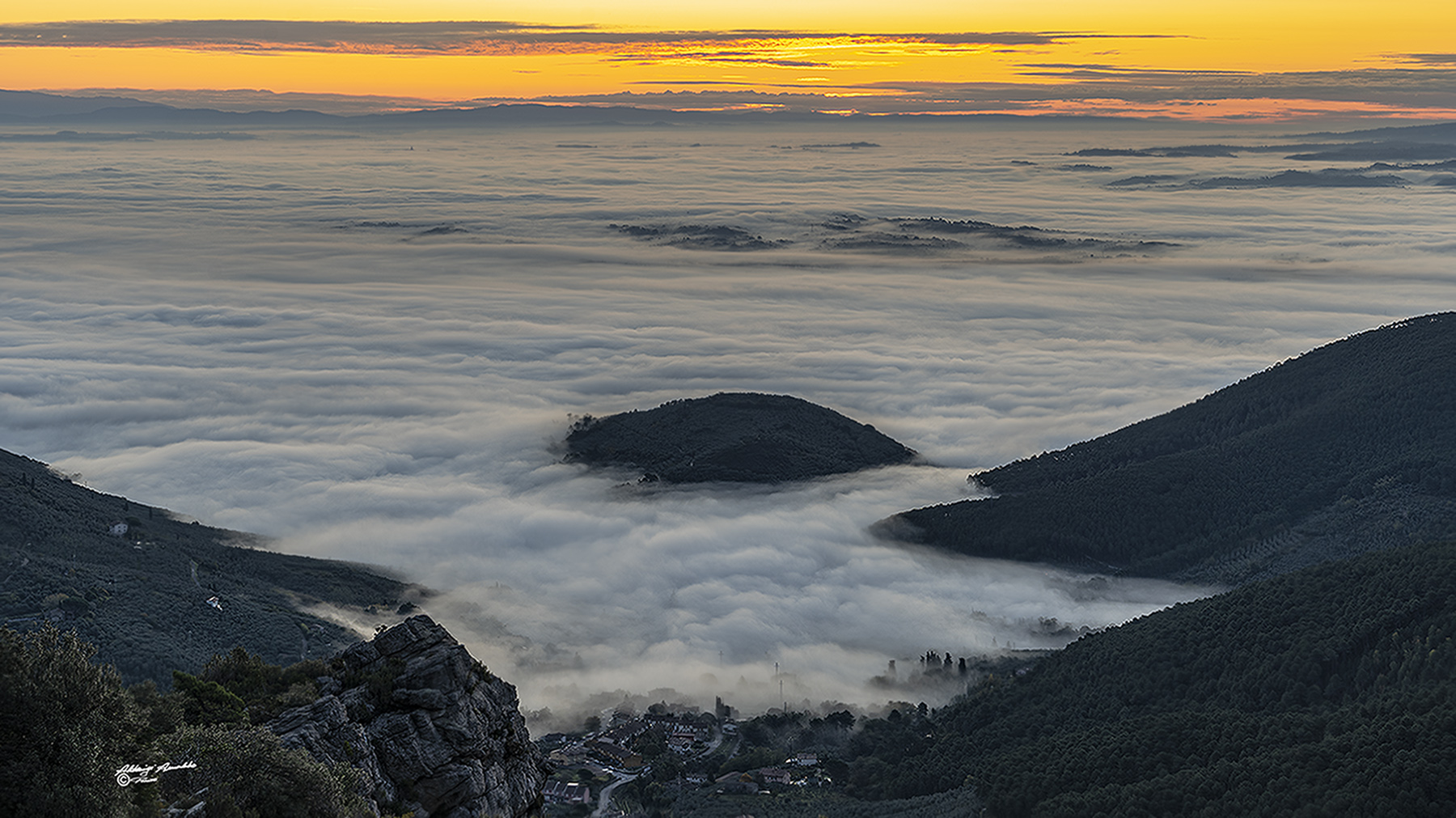 Non è il tramonto ma è l'alba. Alzata molto presto e piccola intuizione di andare in questo luogo ad una altezza di circa 600 mt per riprendere questa meravigliosa vallata.che si può apprezzare con tanta nebbia..