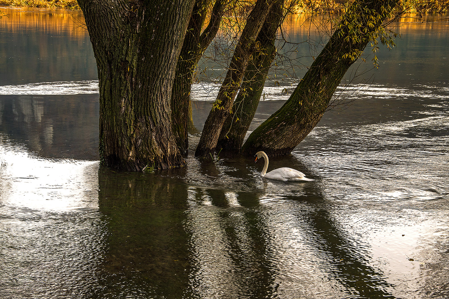 Acqua che alterna vibrazioni e limpidi specchi...luci e ombre.. disegni geometrici e preziosi riflessi. Elegantissimo il cigno che sembra cercare riparo e bellissima la pennellata d'oro in alto. Molto bella Elis _________________