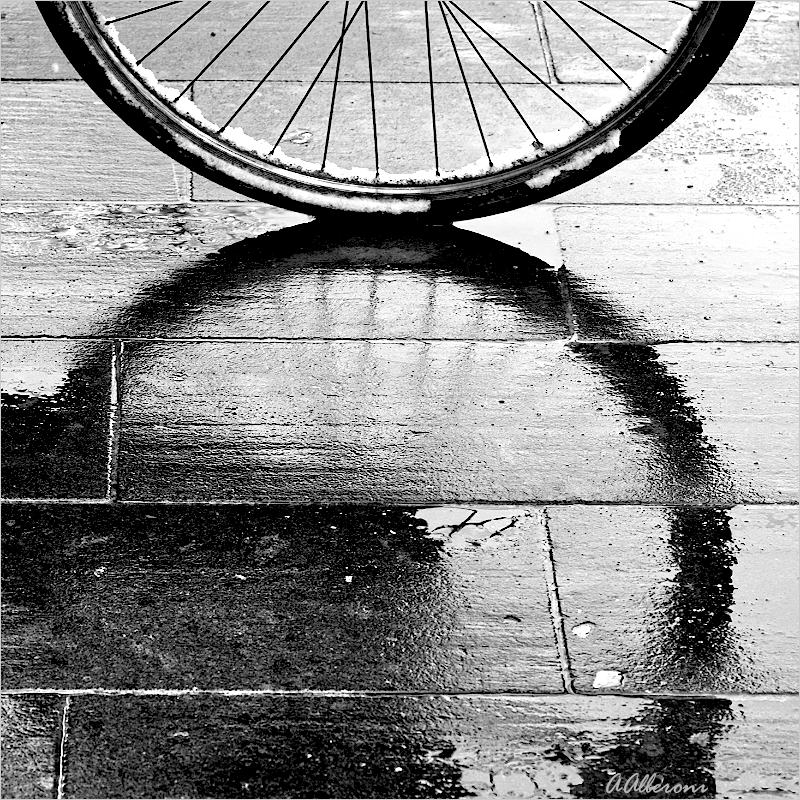 La ruota, centrata nel bordo quadro, attrae per prima l'occhio, ma cede subito il ruolo di protagonista al proprio riflesso/ombra e al selciato bagnato.