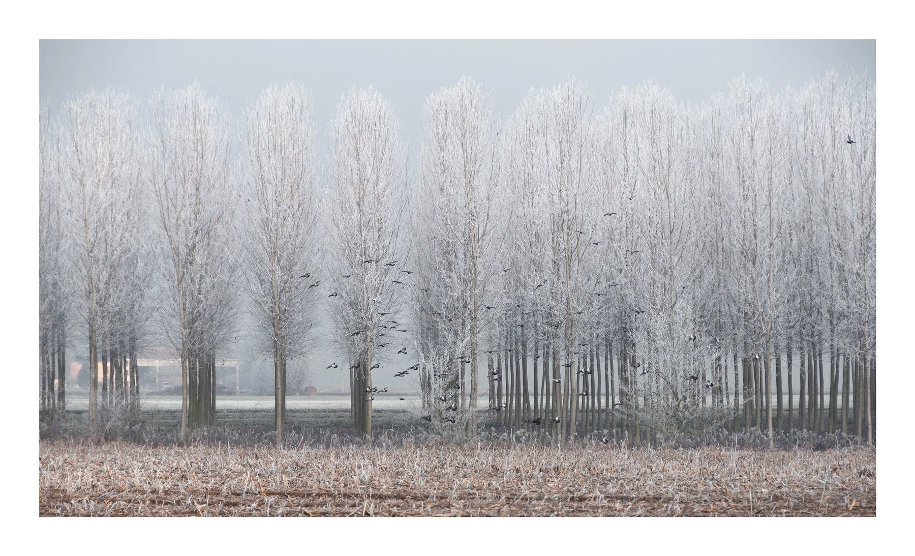 Una gelida mattina immersa nella brina e lo svolazzare degli uccelli rendono una bellissima immagine e atmosfera..Preferita.