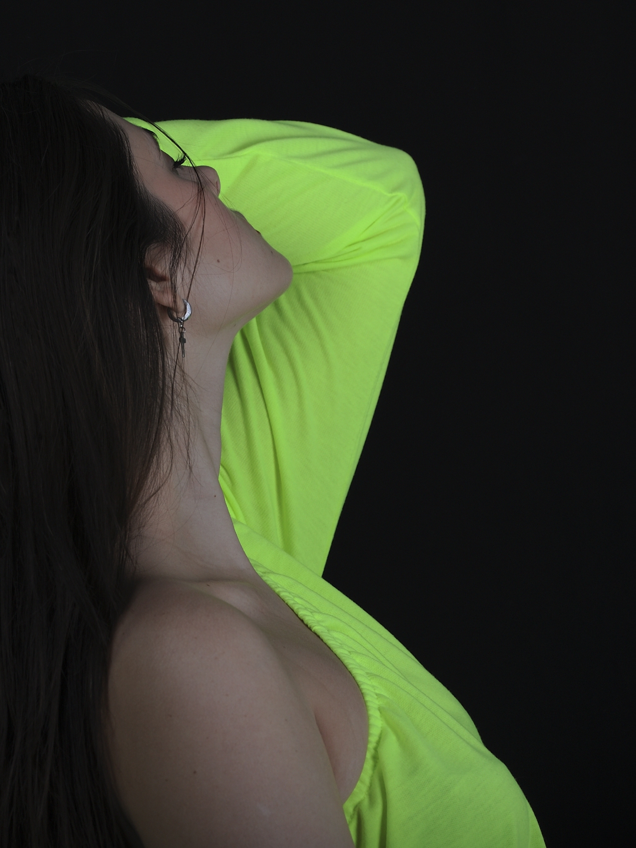 Innanzitutto per quel gialloverde quasi fosforescente che attira l'attenzione pur senza proporre linee o volumi particolarmente attrattivi, poi per quel profilo che perde parti fondamentali come la linea della bocca e del mento, e ancora per i toni spenti della pelle e la massa indistinta dei capelli.
