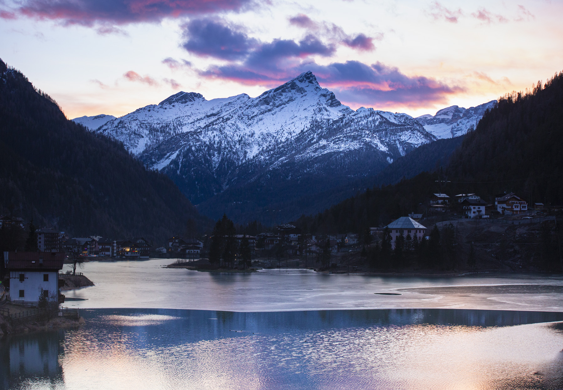 Un bel tramonto che colora le cime sullo sfondo e la superficie dell'acqua, mentre le prime luci iniziano ad accendersi nel paese.