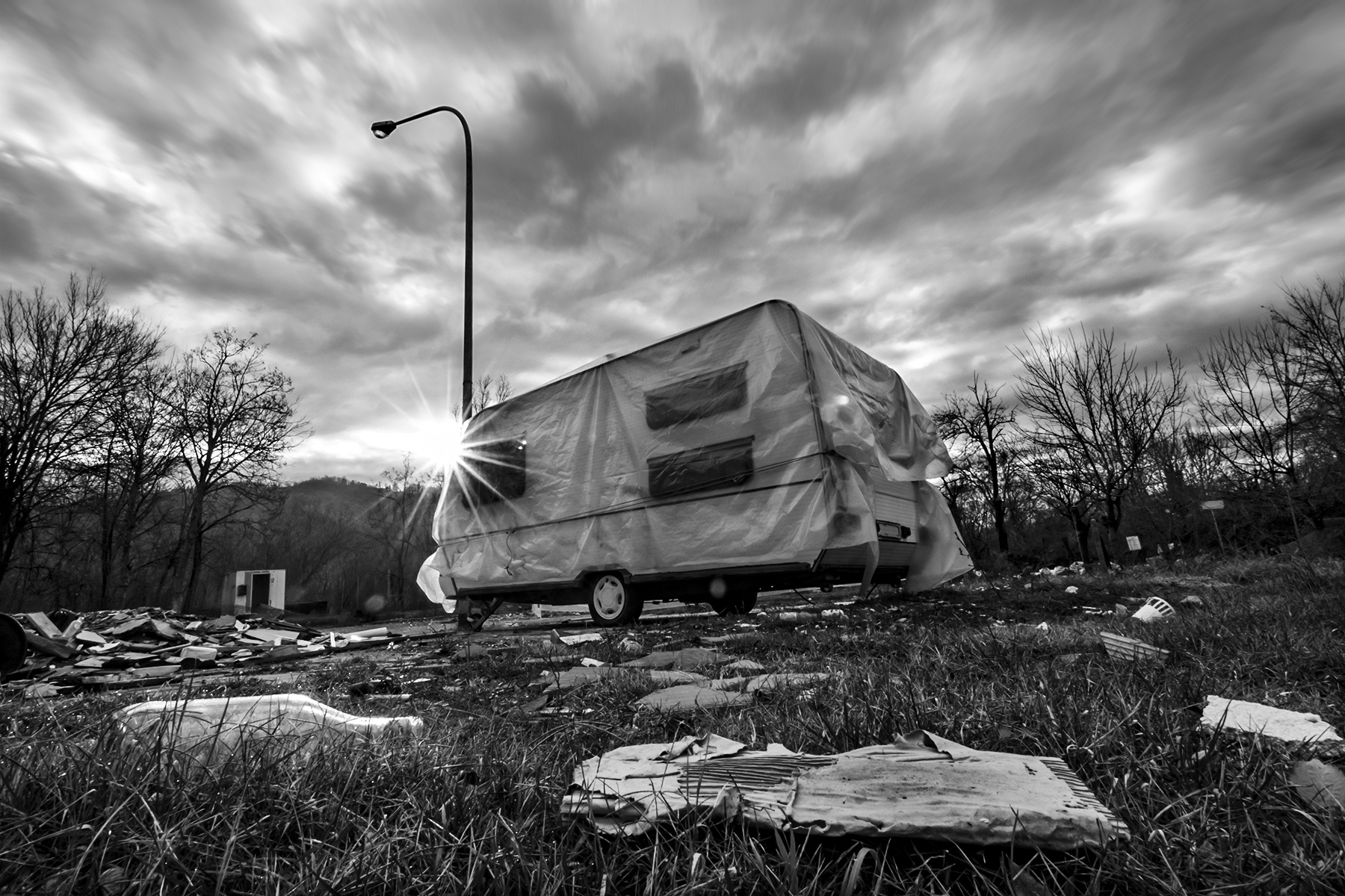 Scena interessante, il contesto la rulotte ed il telo di plastica offrono uno spunto narrativo non da poco. Adeguato il bw. Perfettibile ma valida come proposta. Un caro saluto