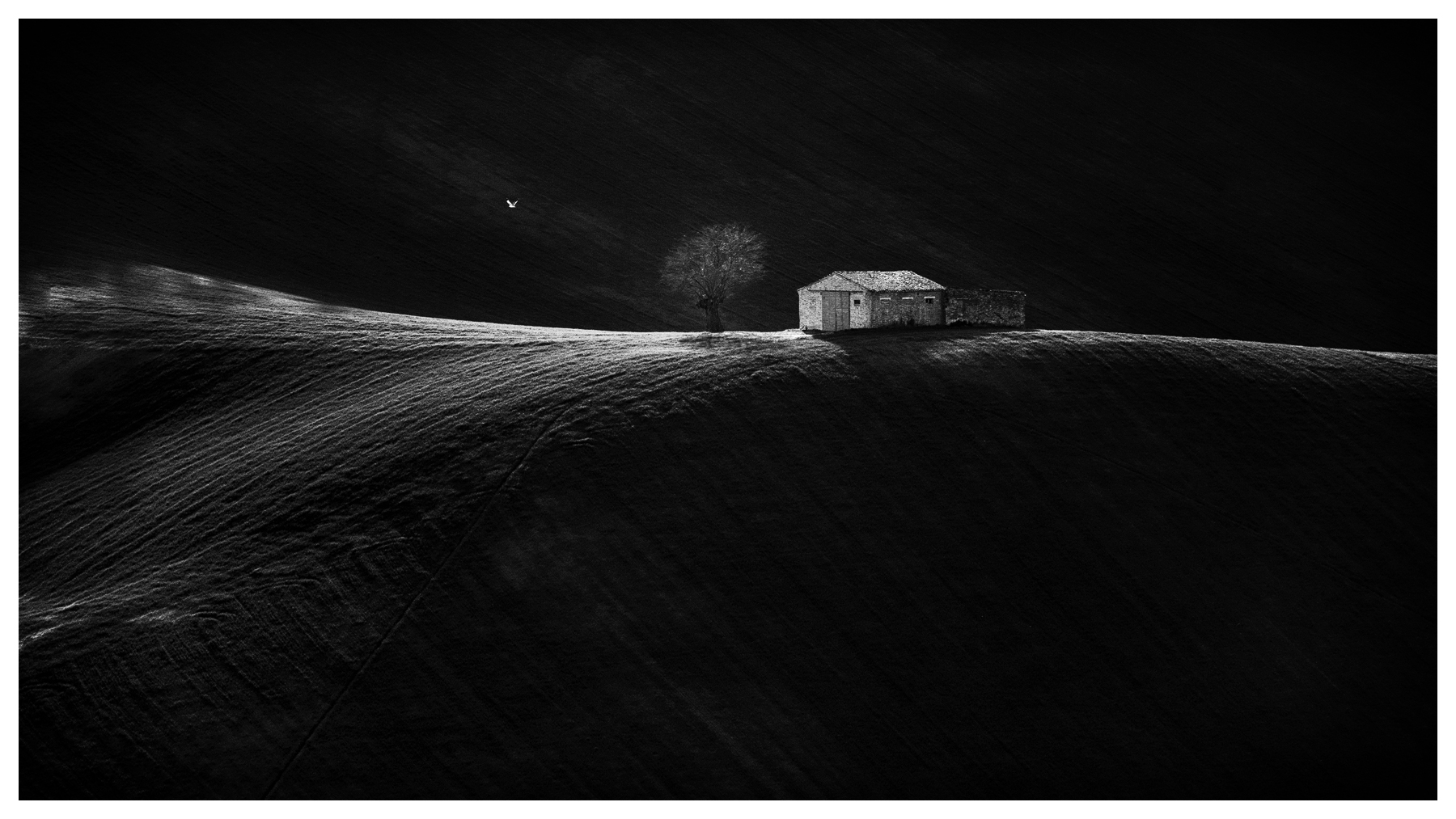 Qui rappresentato con un BN di carattere, la luce accarezza le morbide forme della collina e come un faro illumina il capanno e l'alberello. Il piccolo uccello attira lo sguardo come una stella nella notte.