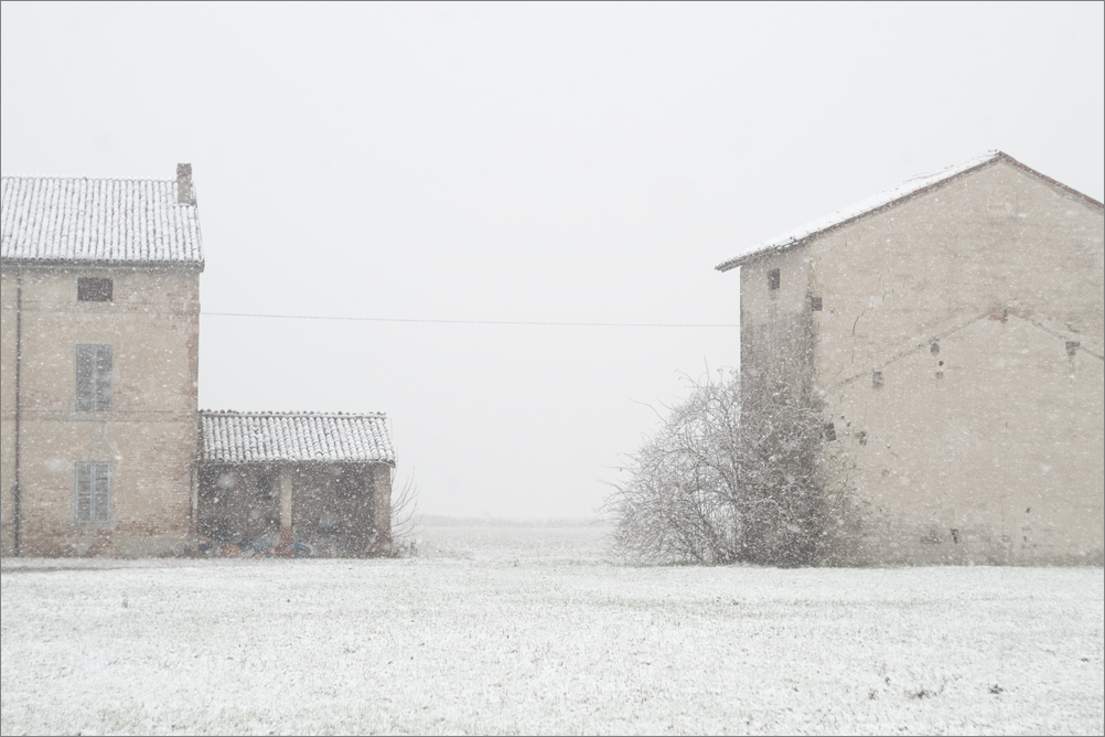Vedere la neve nella campagna è sempre bella, e tu in questo casolare ne ai colto una piacevole immagine..
