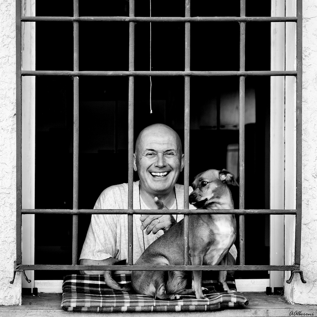 Un sorriso divertito e contagioso..Una solarità incorniciata ma non frenata da queste sbarre, con la fedele compagnia ottima partecipante nella storia. Ben composta e bel bn, un ritratto comunicativo e genuino. Sposto in ritratto  _________________