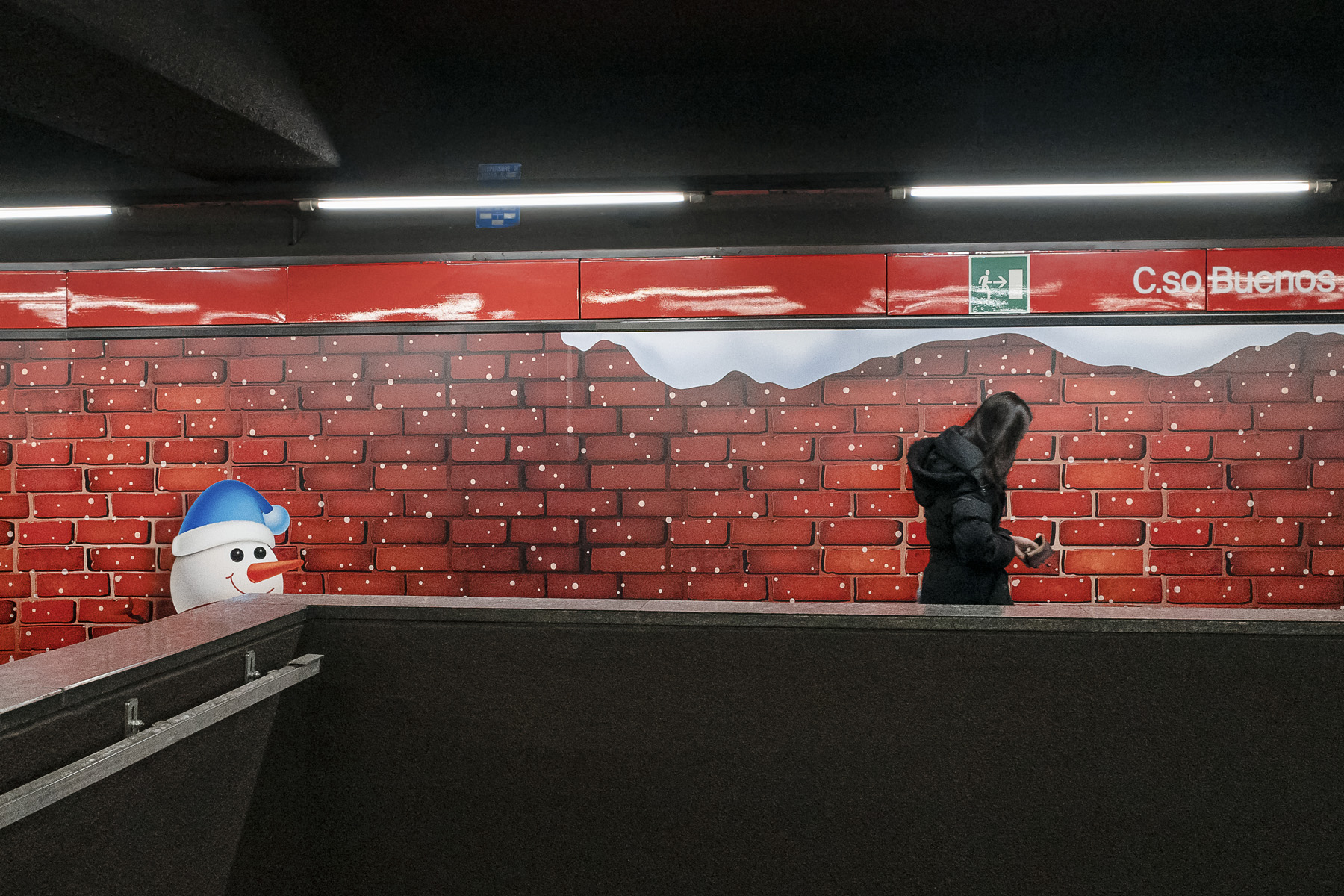 Scena simpatica, con il pupazzo di neve che sembra osservare la donna distratta dall'immancabile telefonino.