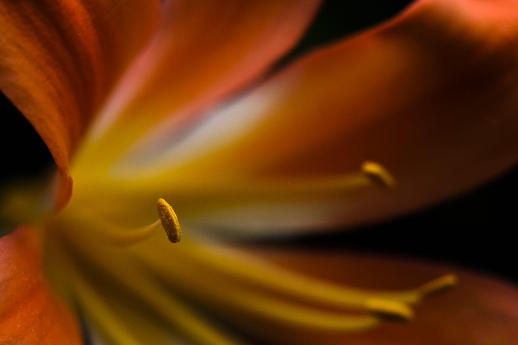 colori brillanti emergono dallo sfondo nero mentre il fuoco selettivo sul pistillo calamita l'attenzione