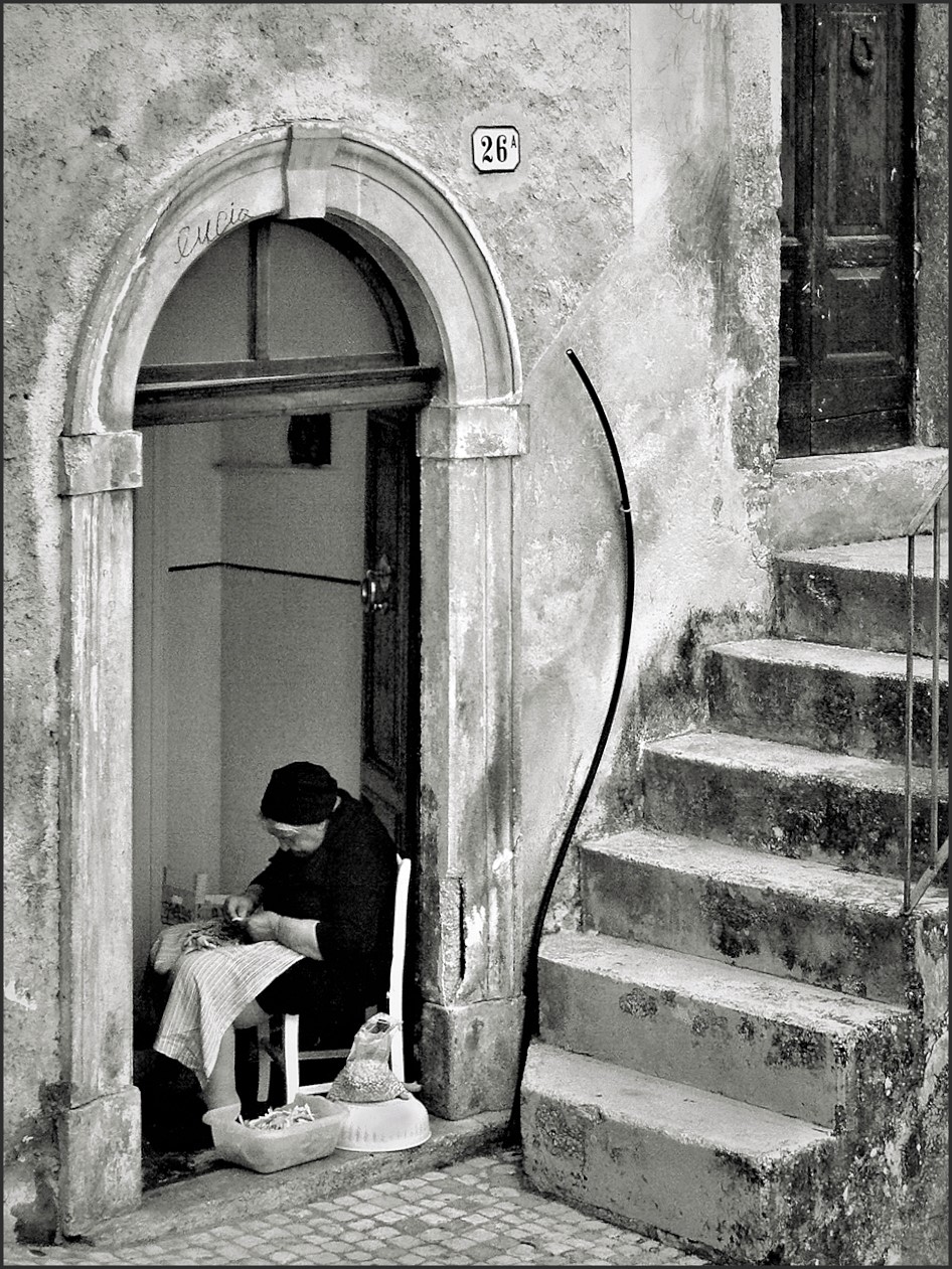 Interessante proposta, la vecchia signora intenta a preparare ed approvvigionare legumi di prima necessita..La scritta sull'arco ci dice tante cose.. Ben vista.