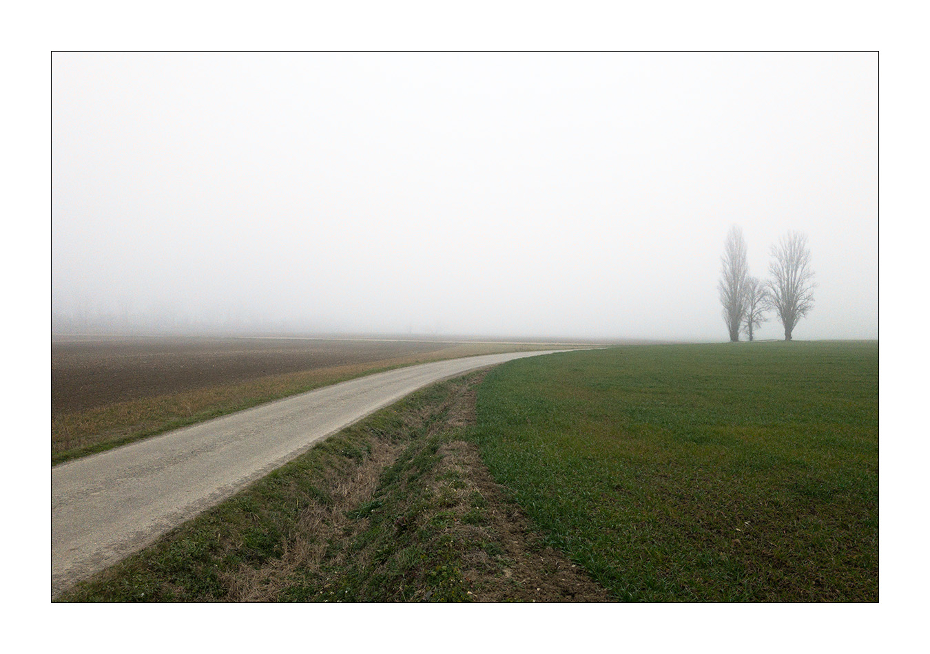 Un tratto di stradina bianca che ci porta ad osservare i tre alberi, e poi tutto rimane da scoprire nella foschia di questa pianura padana.. Ottima composizione.