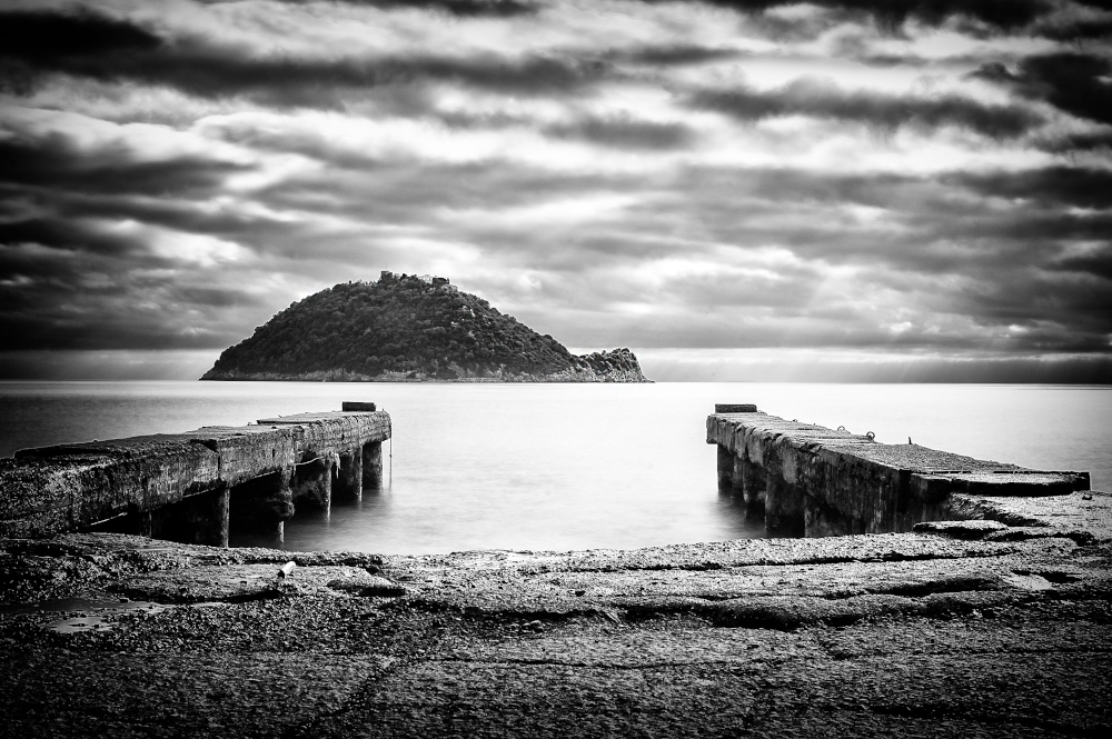 Un bel bn croccante e drammatico che valorizza un cielo ricco e dinamico e la setosità dell'acqua. Mi pare ci sia qualche bordino chiaro intorno ai moli... una proposta che sa coinvolgere Ciao