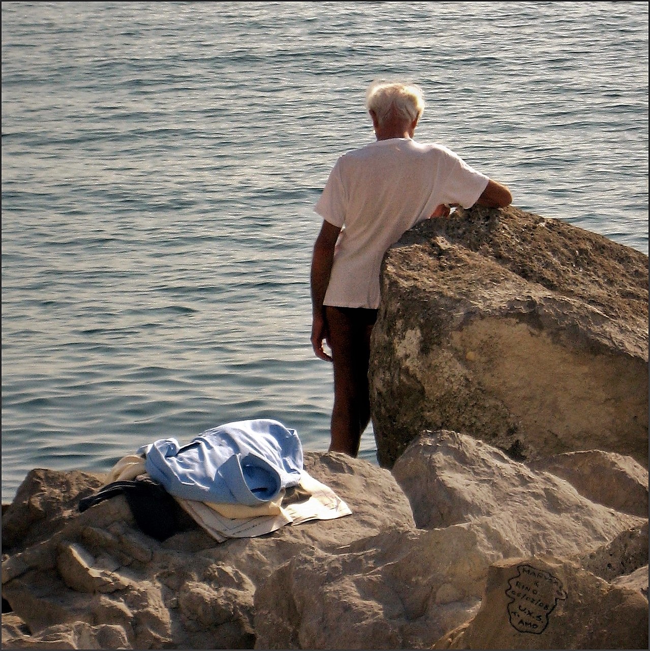 La chiave espressiva, secondo me, sta in quei panni ripiegati e poggiati su un foglio di giornale il signore di spalle mostra la sua età, hai ragione vediamo un signore anziano ma lui dentro di se si sente ancora giovane, è ancora li a ripetere i stessi gesti che faceva da ragazzo, per farsi un bagno o pescare... vive il suo mondo!