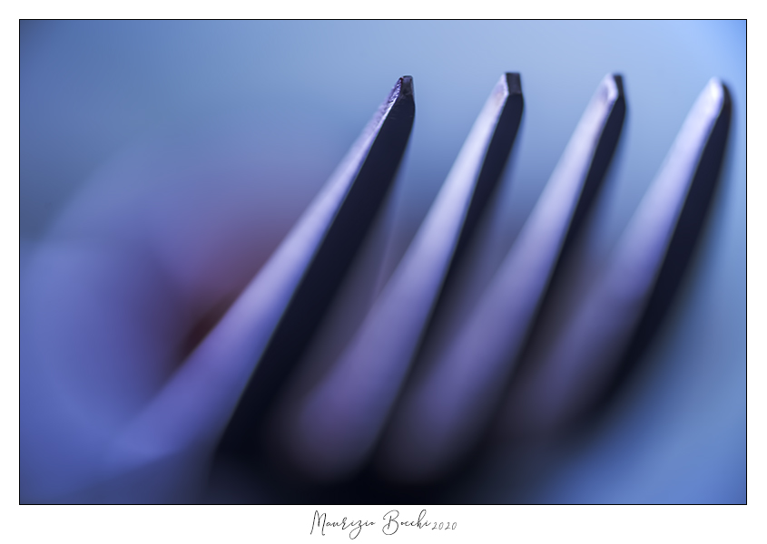 Questo fa parte di tutta una serie di scatti fatti durante la forzata quarantena, dove non sapendo cosa fotografare mi sono dedicato a forchette,cucchiai e bicchieri cercando di concentrarmi principalmente sulle loro forme e linee utilizzando il Tamron 90mm macro con l'aggiunta anche di tubi di prolunga, sfruttando, a volte, la minima messa a fuoco e utilizzando dei cartoncini colorati per creare i riflessi sui soggetti ripresi (come in questo caso il rosso), illuminazione naturale e treppiede. Ho cercato anche di utilizzare quando possibile degli f aperti per isolare magari delle linee caratteristiche degli oggetti fotografati.