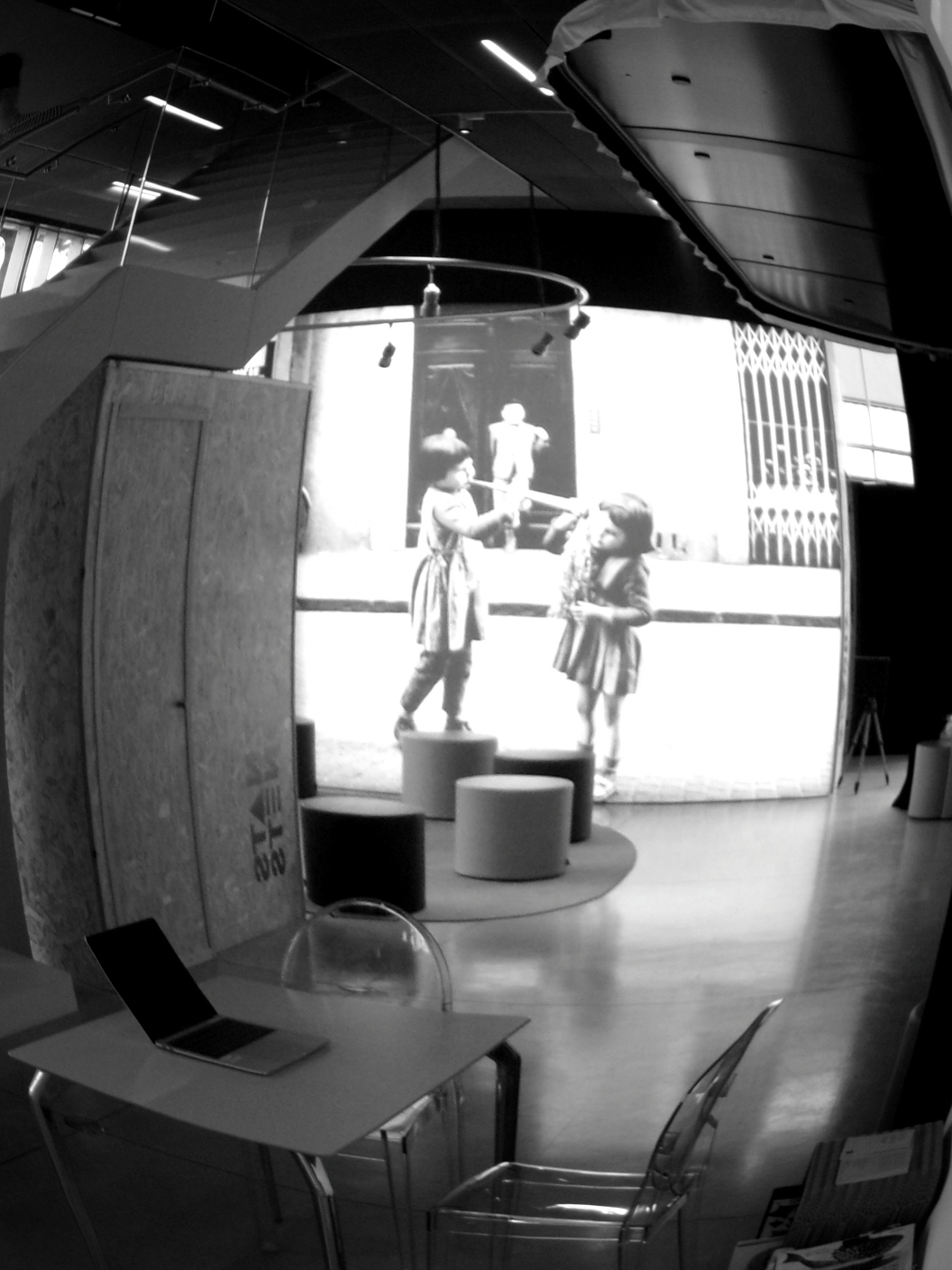 Il soggetto è interessante, ma c' è troppa roba dentro .. lo sguardo sbatte come una pallina di un flipper: qual' è il vero soggetto .. il notebook o bimbi dietro ? Poi il soffitto e l' arredamento interno creano ulteriore disordine visivo.