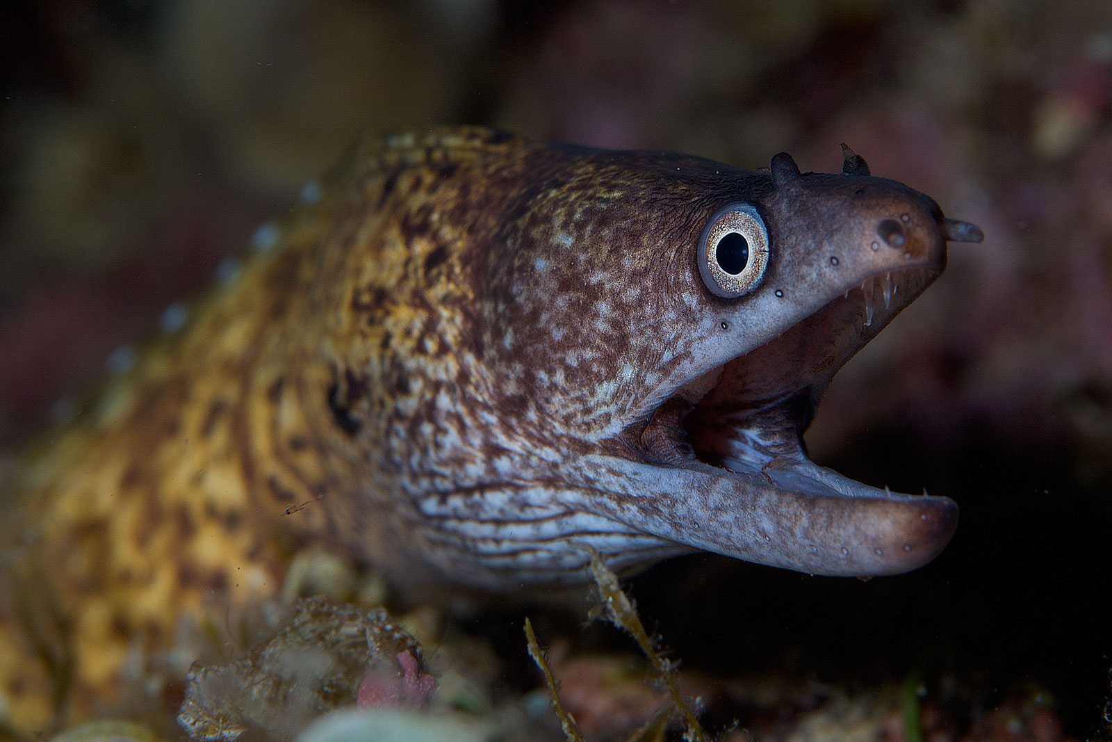 Una piccola Murena (Murena helena) spunta dall'imboccatura della sua tana.