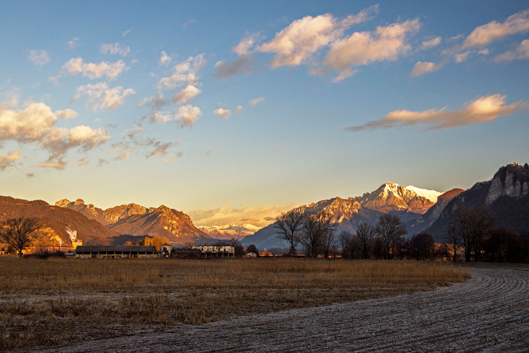 Le condizioni di luce sono reali; luce verso le montagne e per qualche minuto ancora, ombra sulla destra, dove scorre il fiume. Poi s'alzerà il sole e si formerà la nebbia.