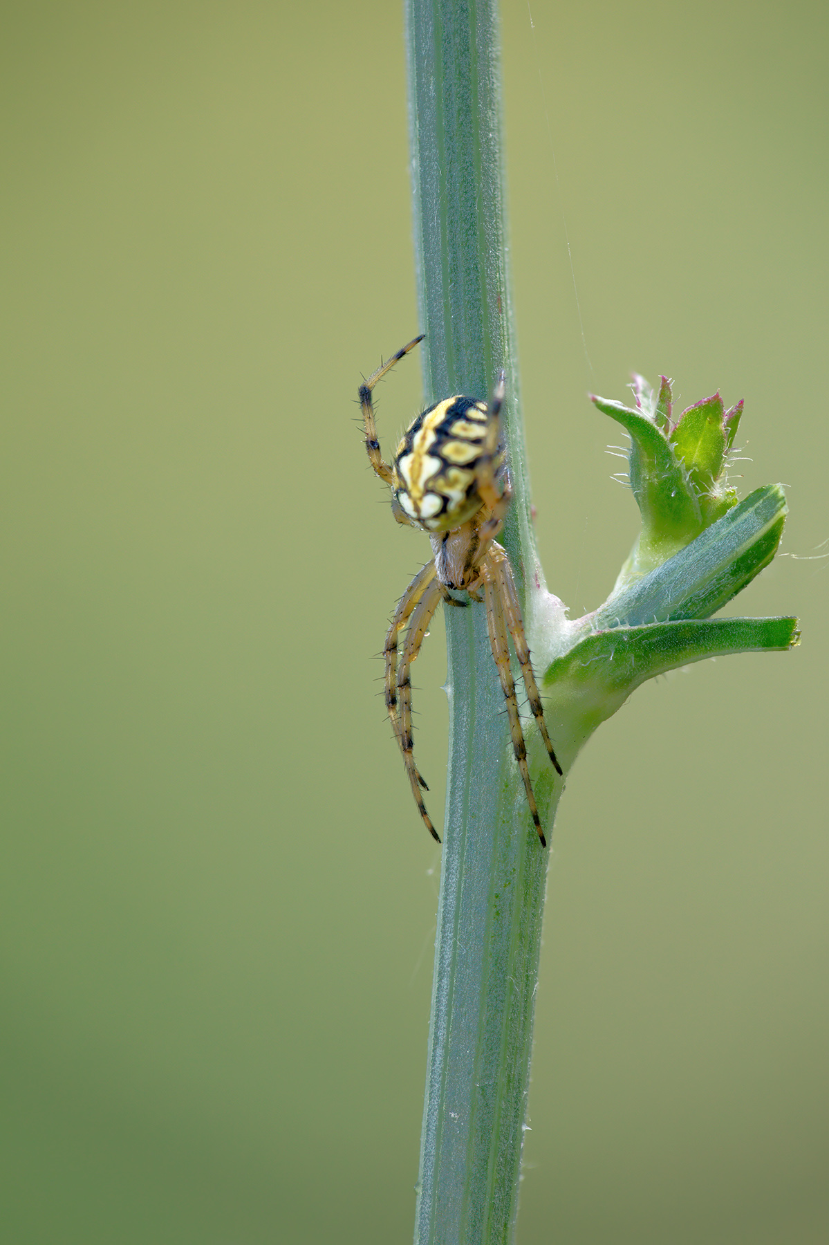 C'è una zampina non a fuoco...dovrebbe essere un'argiope bruennichi, piccola, sarà stata 2 cm, la prima di quest'anno.