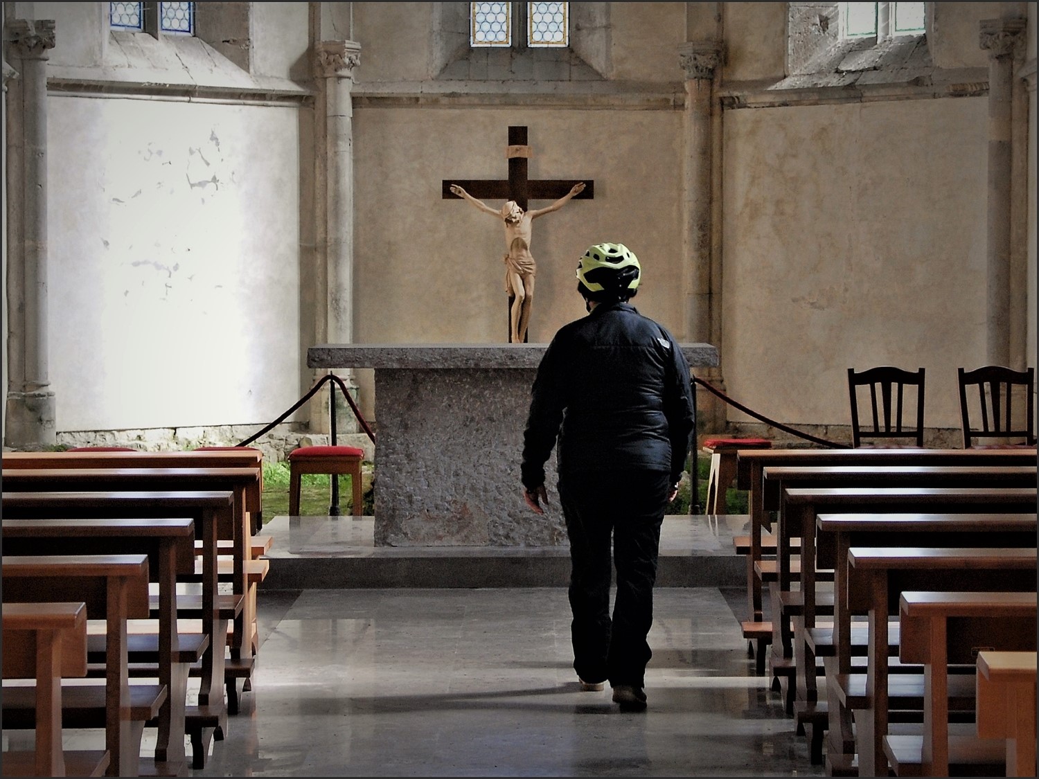Al cospetto di Gesù con il caschetto...immagine sicuramente insolita,colta e composta ottimamente! Una curiosità....sbaglio o dietro l'altare c'è l'erba??