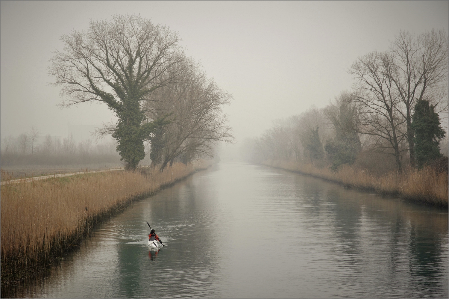un bel paesaggio nebbioso, unico segno di vita il canoista solitario che si gode il silenzio. Un'atmosfera che mi affascina molto