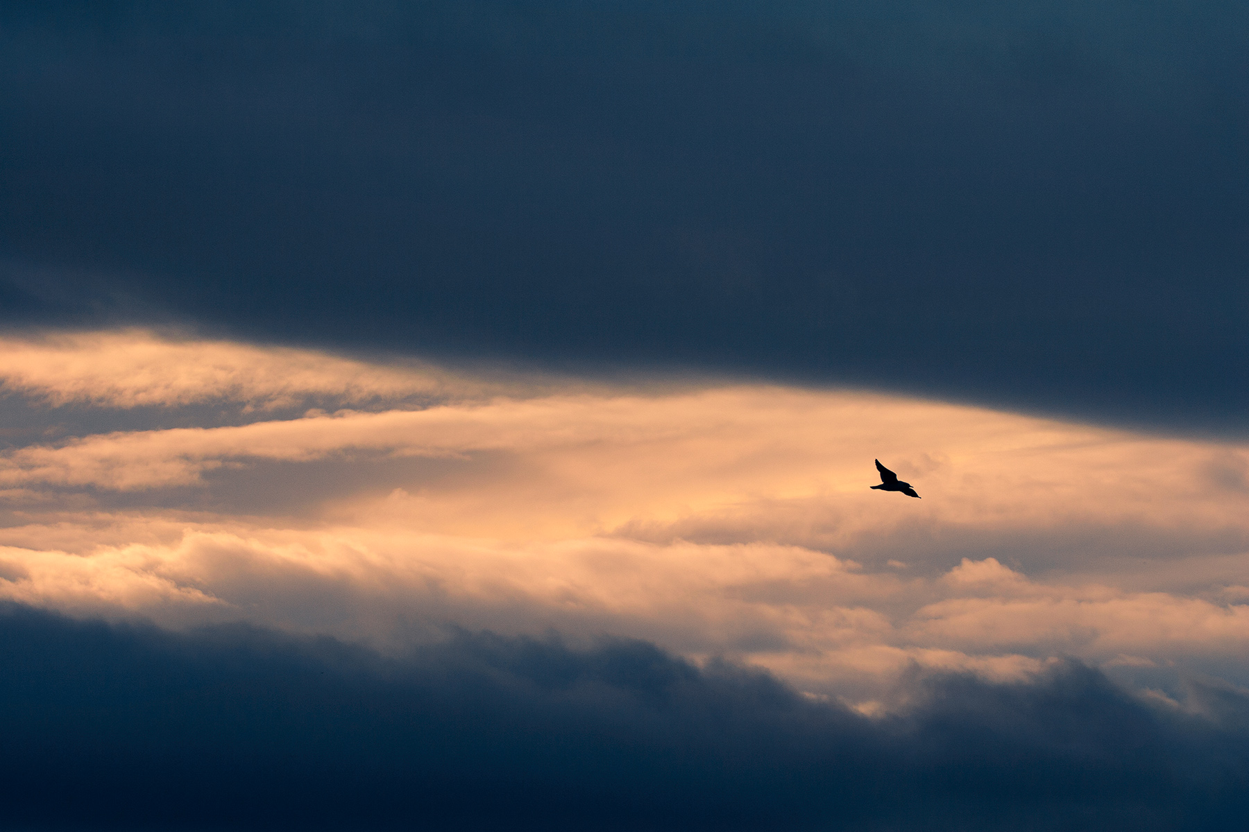 Molto piacevole questo scatto,i colori del cielo che si dividono, e l'inserimento del volatile nella parte più chiara dandone una buona immagine.. Ciao