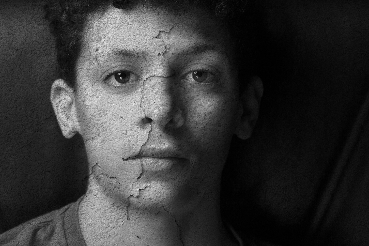 Ho ottenuto questa immagine semplicemente sovrapponendo con Ps il ritratto del ragazzo e la foto di un muro scrostato