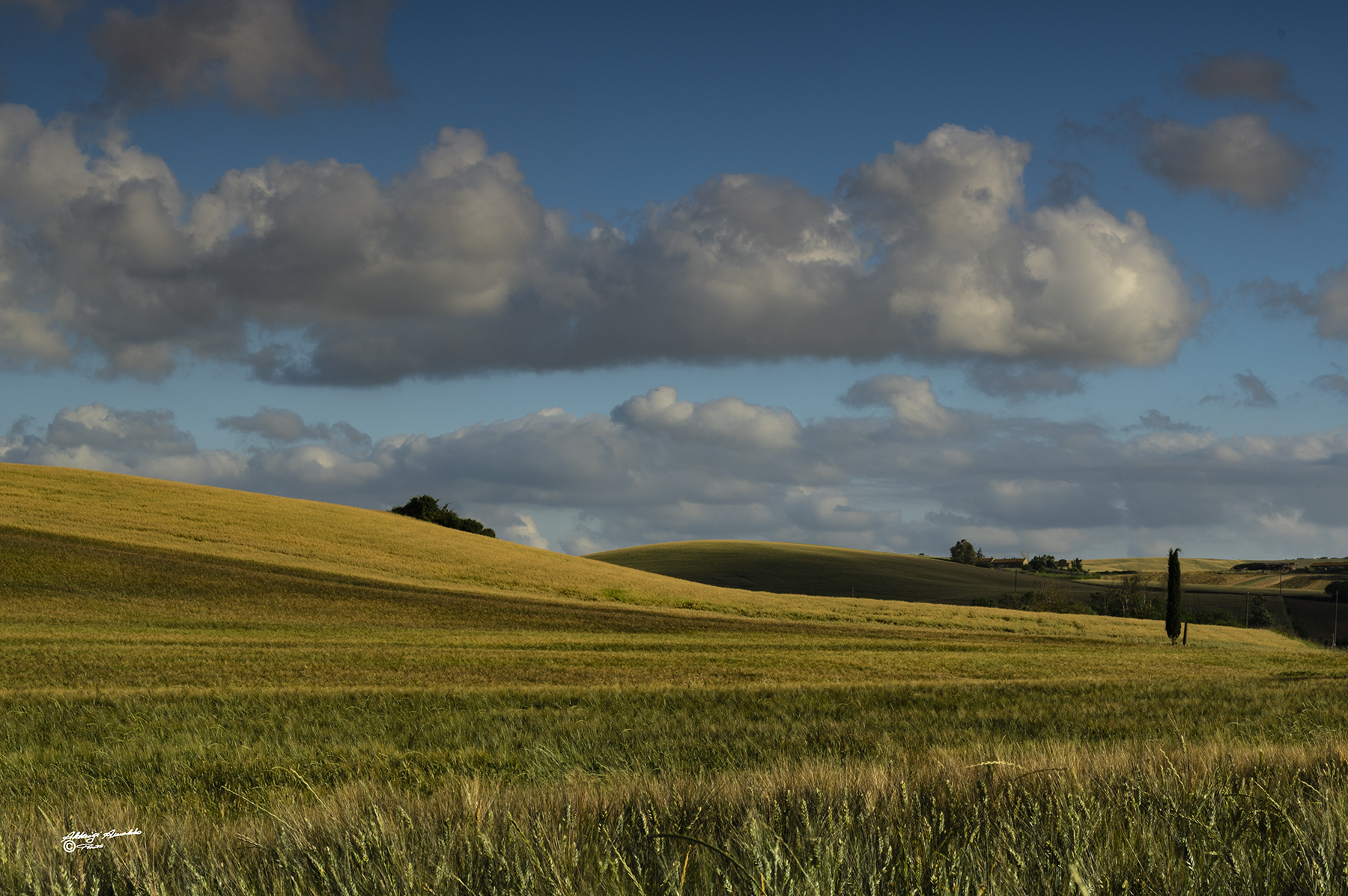 Piacevole ripresa campestre, dolci colline dorate e un cielo interessante ricco di nubi. Tuttavia lo scatto è visivamente sottoesposto e che, a mio avviso, con le giuste correzioni migliora.