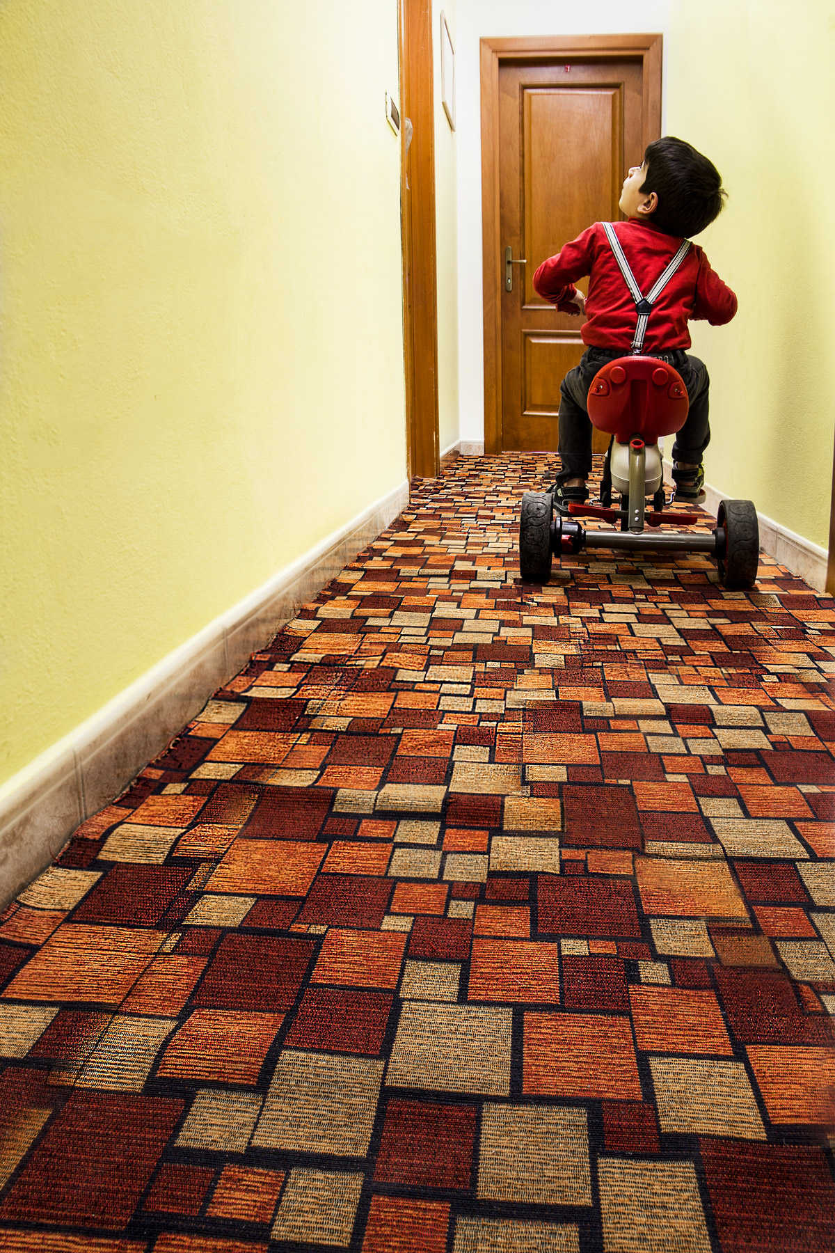 Ben realizzata! Molto interessante il disegno dei tappeto i cui toni si ritrovano nella camicia, triciclo e porte. Avrei optato (se possibile, immagino sia casalinga) per una prospettiva centrale.