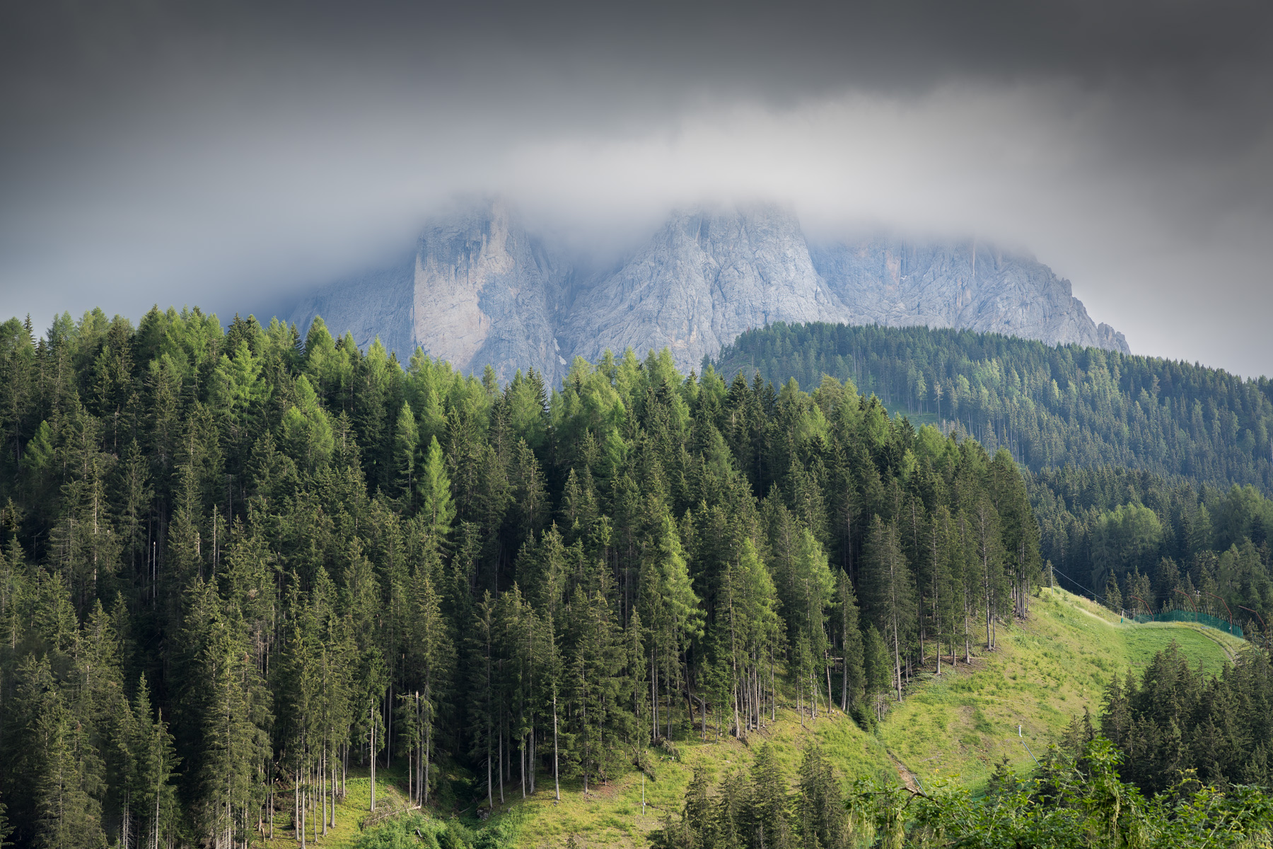 Trovo molto affascinante il monte coperto dalle nubi. Per questo motivo la parte in basso a destra distrae un po' secondo me. Con un taglio che enfatizzi le due linee di alberi e le montagne penso ne guadagnerebbe.