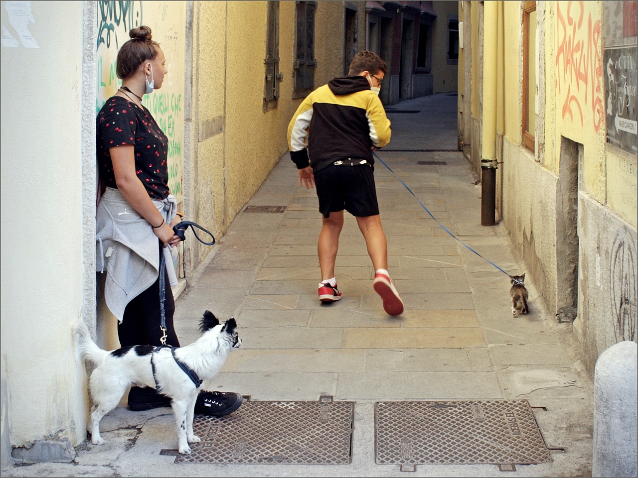 Molto carino il contrasto tra gli animali al guinzaglio (rarissimo il gatto, forse era per uscire di casa durante il lockdown? ), anche lo sguardo della signora ne è stupito