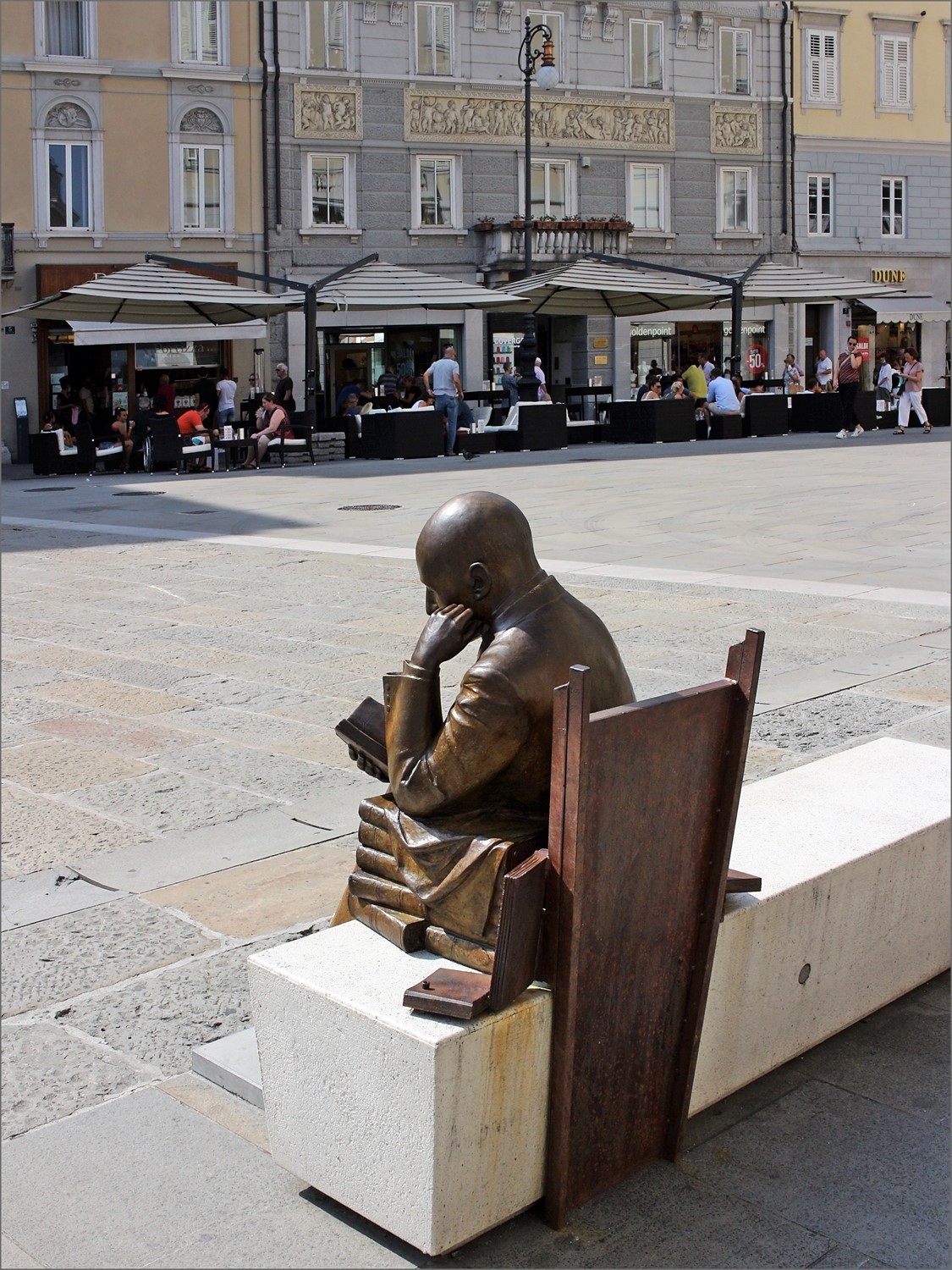 | Povero D'Annunzio, senza riparo dal sole feroce. Tutti sullo sfondo scelgono invece l'ombra.  Simpatica inquadratura! Ma alla fine il poeta non ė solo: probabilmente il sole picchia anche sul fotografo vagante. Ciao, Francesco _________________
