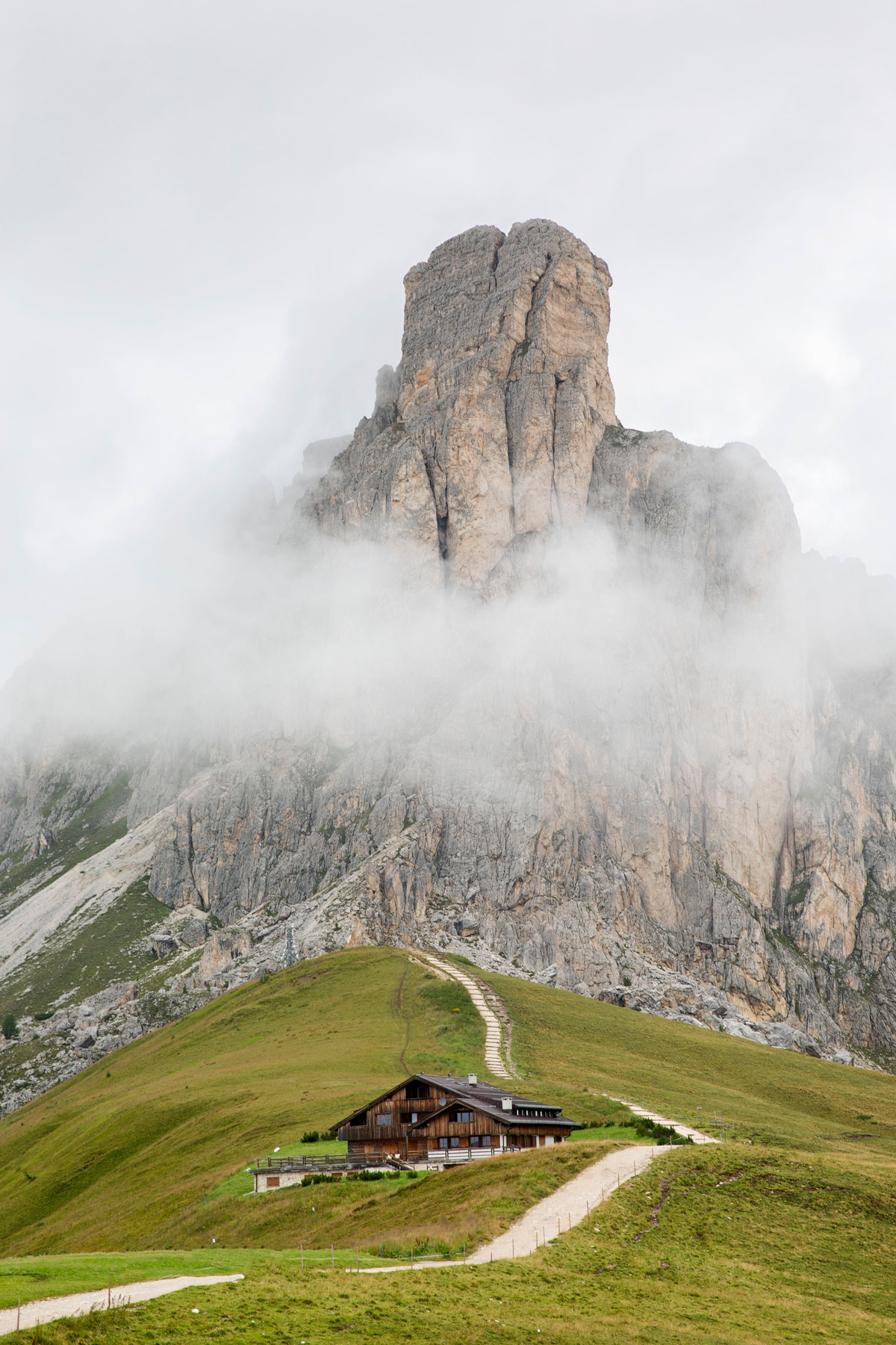 Buona la composizione in verticale, la stradina porta avanti lo sguardo, la nube che avvolge la cima completa l'ottima scena.