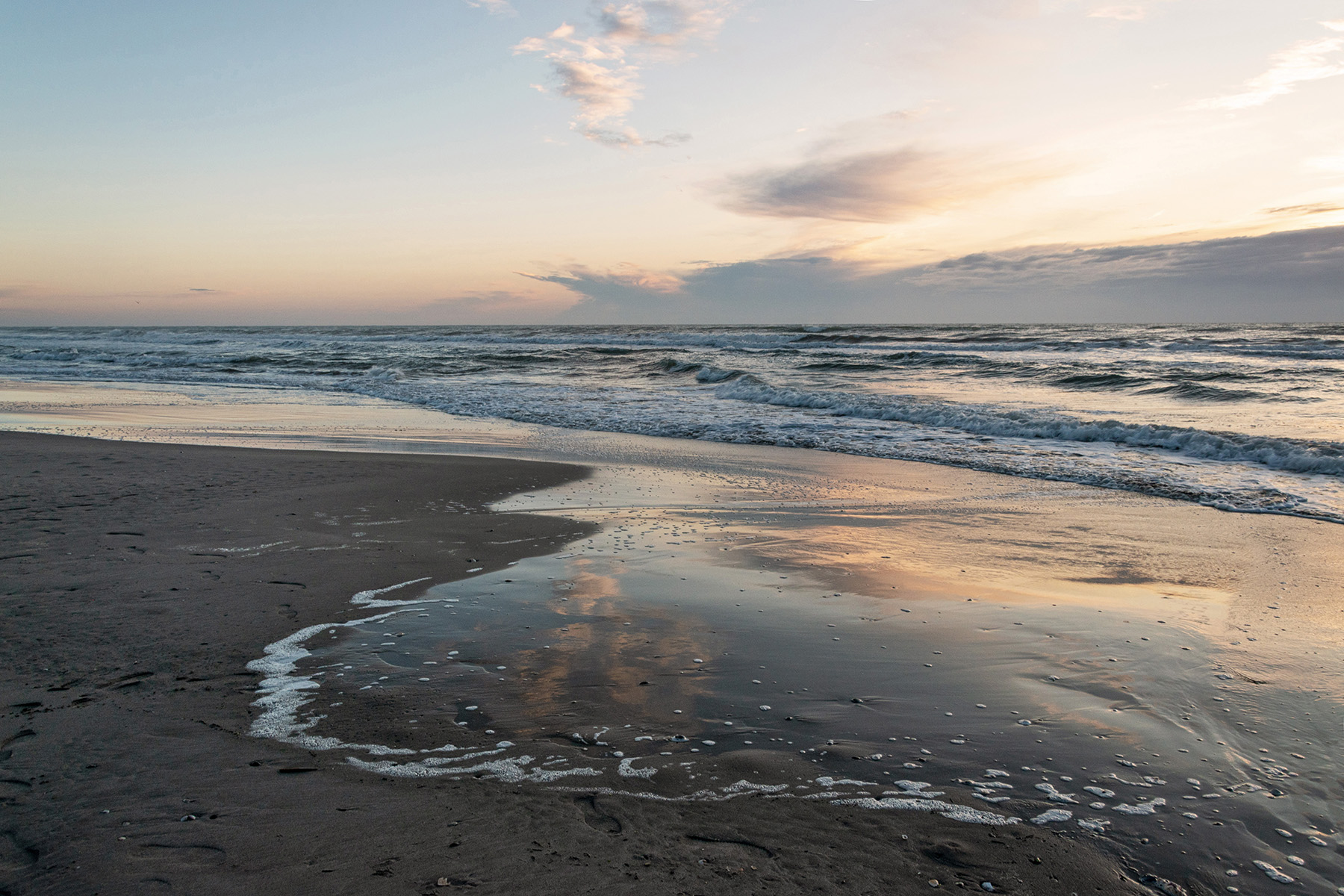 Il riflesso sulla battigia è il fulcro del paesaggio.